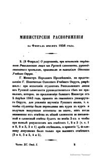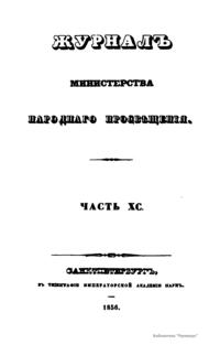 Журнал Министерства народного просвещения выходил с 1834-го по 1917 год. Официальный периодический журнал об успехах просвещения в России. Издатели журнала уверены в том, что «если для каждого человека необходим выход из грубой тьмы невежества и беспрерывное дальнейшее движение к свету, то для народов необходимо попечительное участие правительства в образовании. Только правительство имеет все средства знать и высоту успехов всемирного образования, и настоящие нужды Отечества».