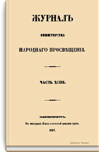 Журнал Министерства народного просвещения выходил с 1834-го по 1917 год. Официальный периодический журнал об успехах просвещения в России. Издатели журнала уверены в том, что «если для каждого человека необходим выход из грубой тьмы невежества и беспрерывное дальнейшее движение к свету, то для народов необходимо попечительное участие правительства в образовании. Только правительство имеет все средства знать и высоту успехов всемирного образования, и настоящие нужды Отечества».