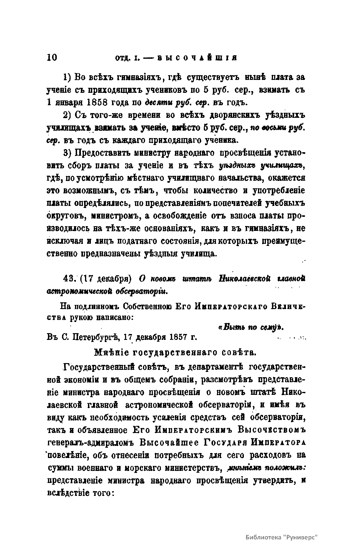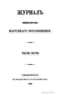 Журнал Министерства народного просвещения выходил с 1834-го по 1917 год. Официальный периодический журнал об успехах просвещения в России. Издатели журнала уверены в том, что «если для каждого человека необходим выход из грубой тьмы невежества и беспрерывное дальнейшее движение к свету, то для народов необходимо попечительное участие правительства в образовании. Только правительство имеет все средства знать и высоту успехов всемирного образования, и настоящие нужды Отечества».