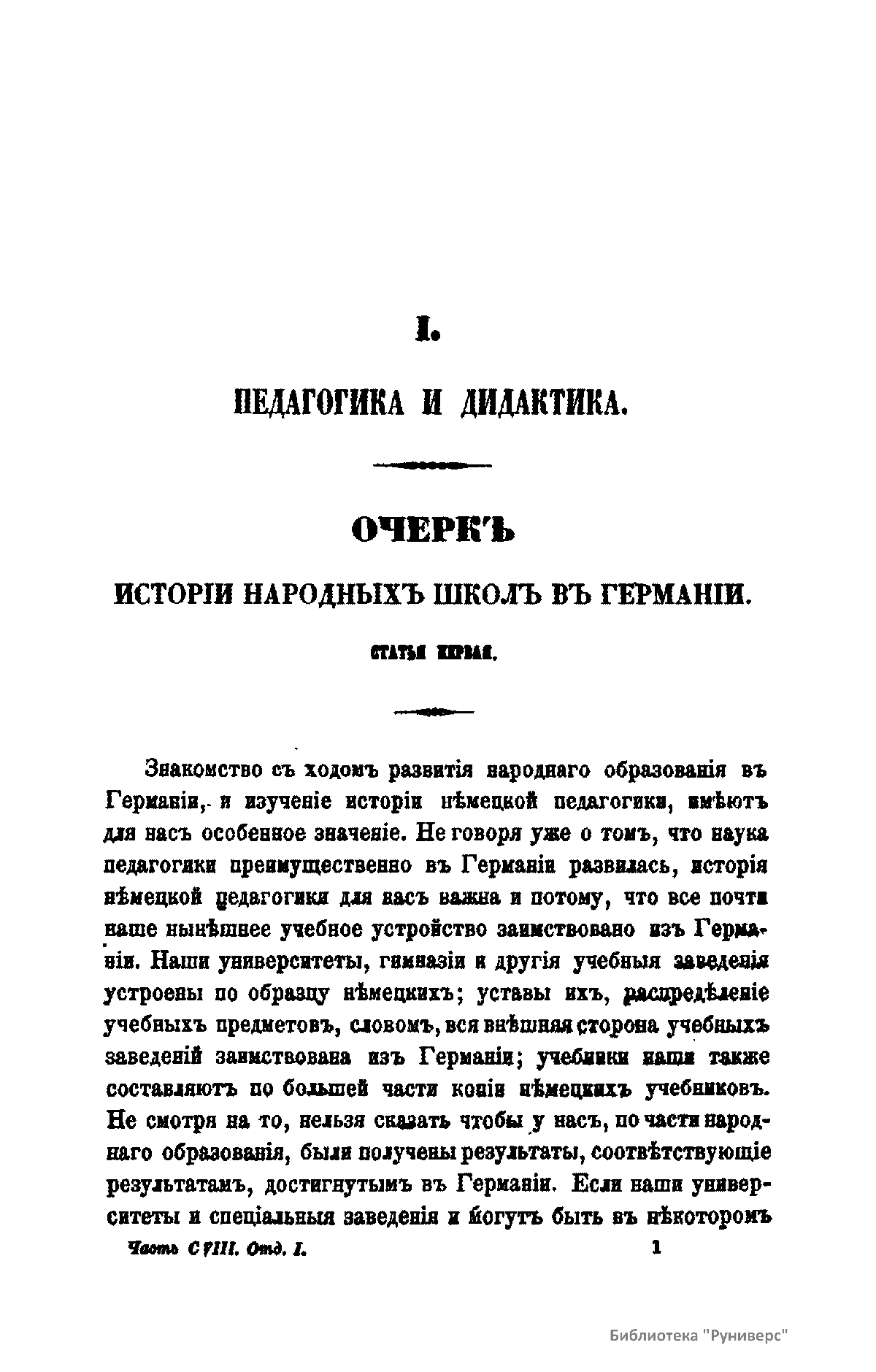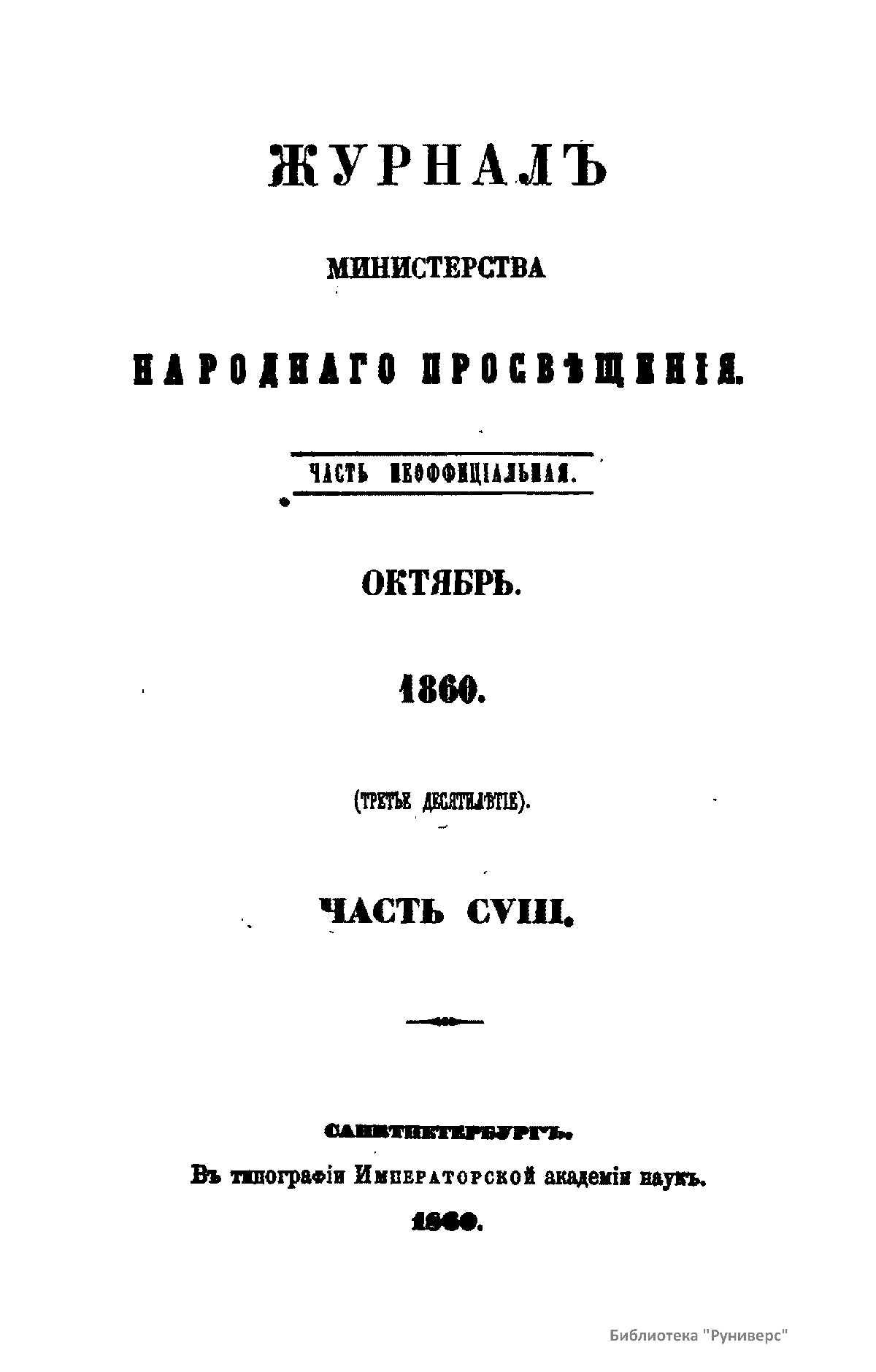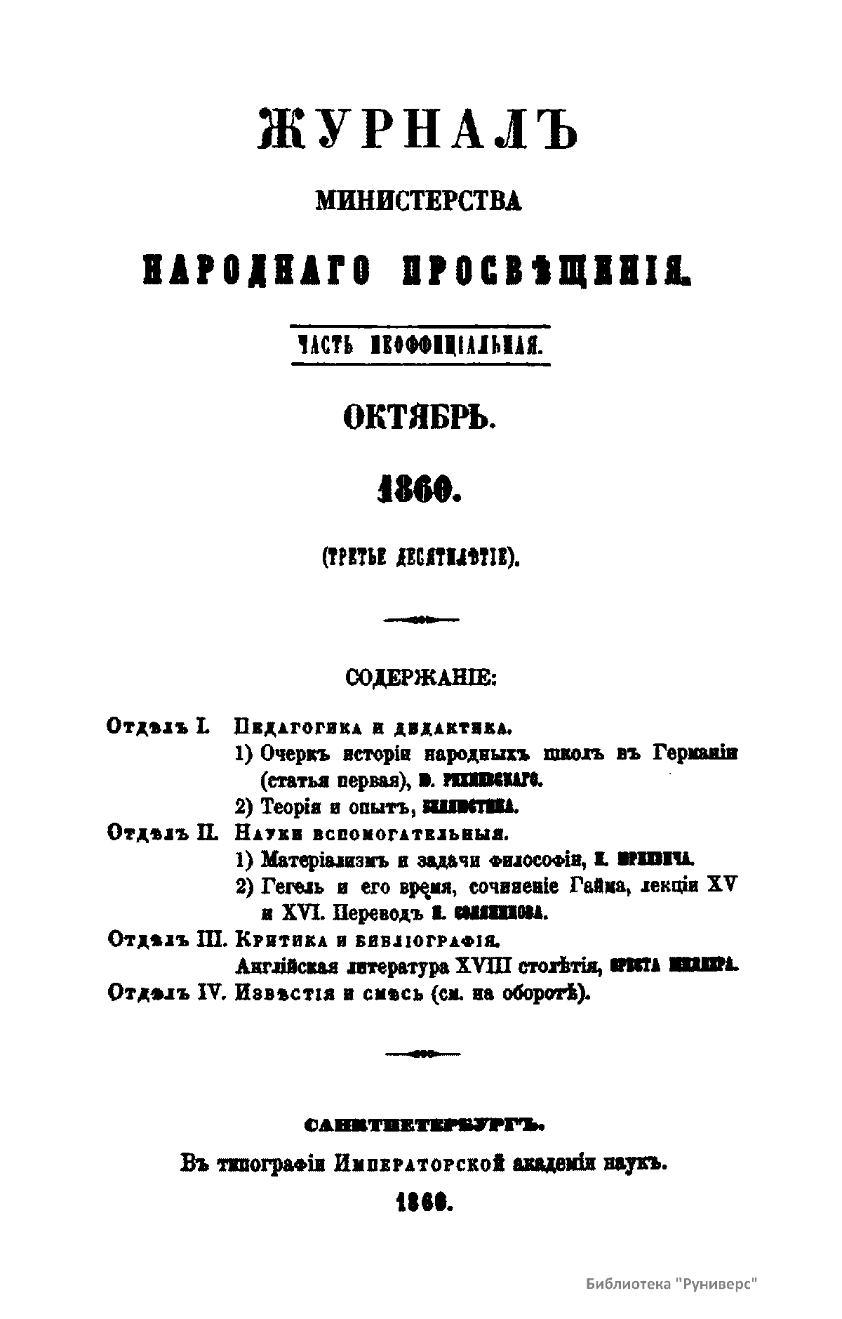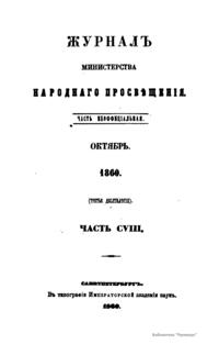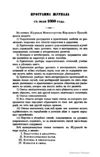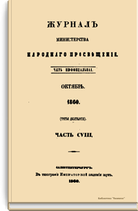 Журнал Министерства народного просвещения выходил с 1834-го по 1917 год. Официальный периодический журнал об успехах просвещения в России. Издатели журнала уверены в том, что «если для каждого человека необходим выход из грубой тьмы невежества и беспрерывное дальнейшее движение к свету, то для народов необходимо попечительное участие правительства в образовании. Только правительство имеет все средства знать и высоту успехов всемирного образования, и настоящие нужды Отечества».