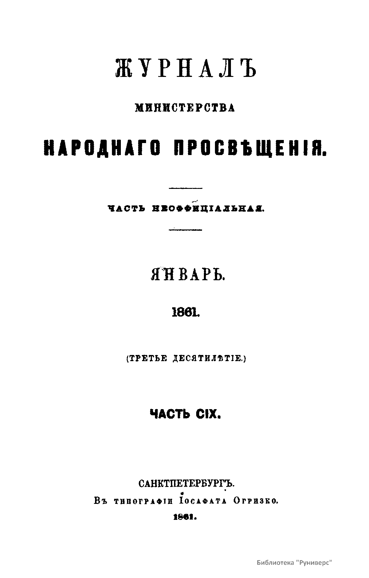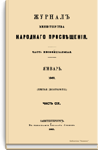 Журнал Министерства народного просвещения выходил с 1834-го по 1917 год. Официальный периодический журнал об успехах просвещения в России. Издатели журнала уверены в том, что «если для каждого человека необходим выход из грубой тьмы невежества и беспрерывное дальнейшее движение к свету, то для народов необходимо попечительное участие правительства в образовании. Только правительство имеет все средства знать и высоту успехов всемирного образования, и настоящие нужды Отечества».