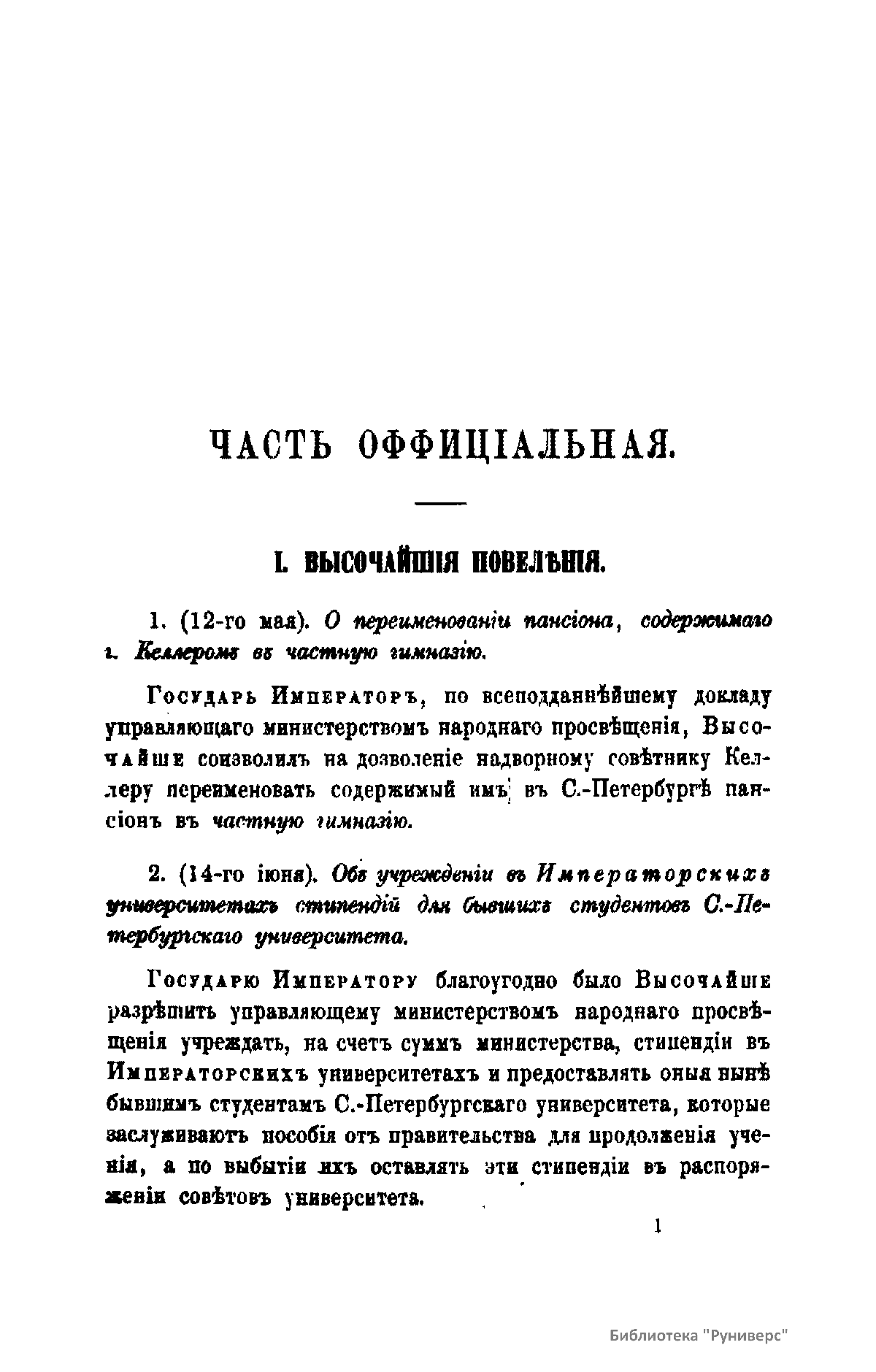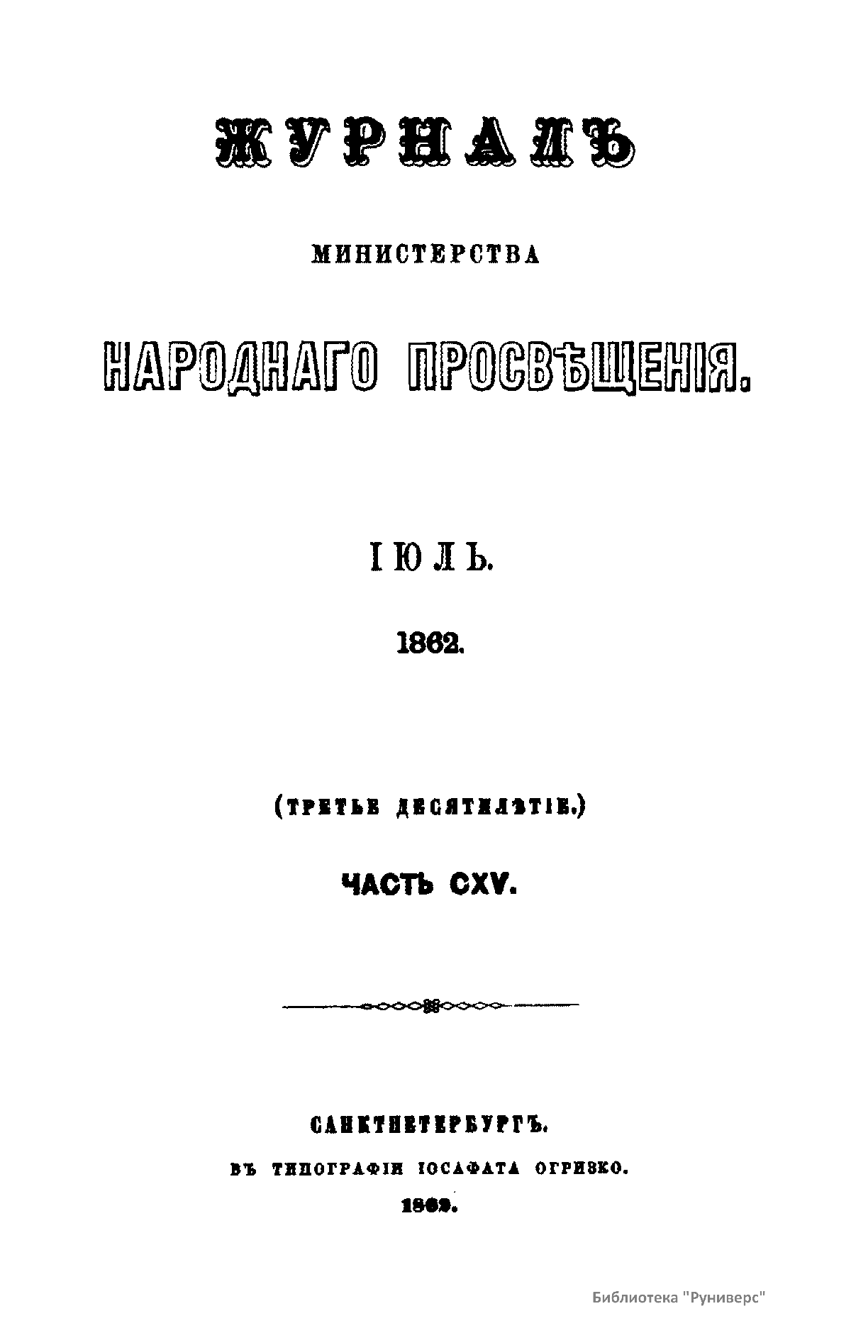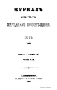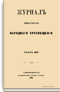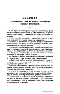Журнал Министерства народного просвещения выходил с 1834-го по 1917 год. Официальный периодический журнал об успехах просвещения в России. Издатели журнала уверены в том, что «если для каждого человека необходим выход из грубой тьмы невежества и беспрерывное дальнейшее движение к свету, то для народов необходимо попечительное участие правительства в образовании. Только правительство имеет все средства знать и высоту успехов всемирного образования, и настоящие нужды Отечества».