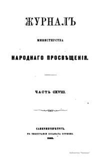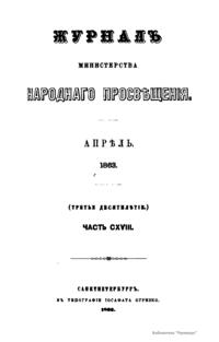 Журнал Министерства народного просвещения выходил с 1834-го по 1917 год. Официальный периодический журнал об успехах просвещения в России. Издатели журнала уверены в том, что «если для каждого человека необходим выход из грубой тьмы невежества и беспрерывное дальнейшее движение к свету, то для народов необходимо попечительное участие правительства в образовании. Только правительство имеет все средства знать и высоту успехов всемирного образования, и настоящие нужды Отечества».