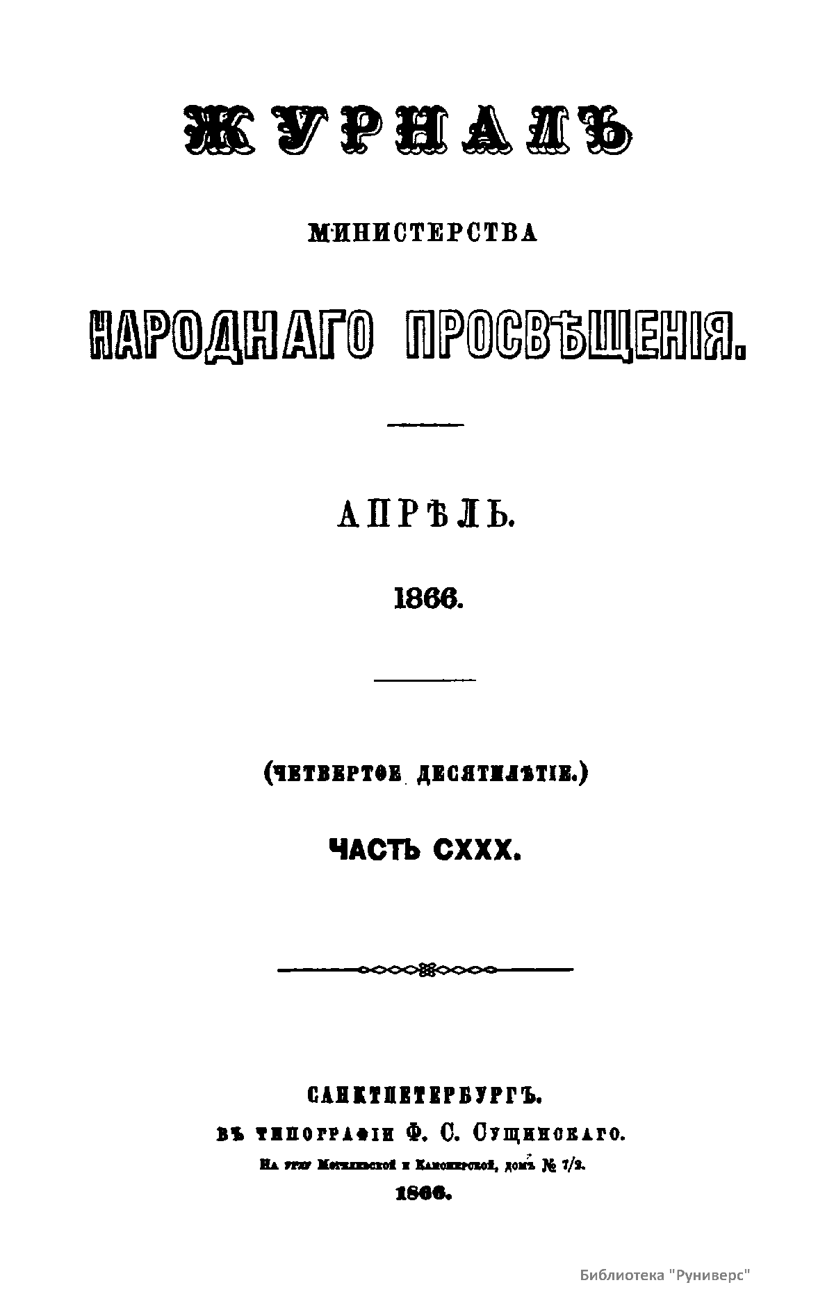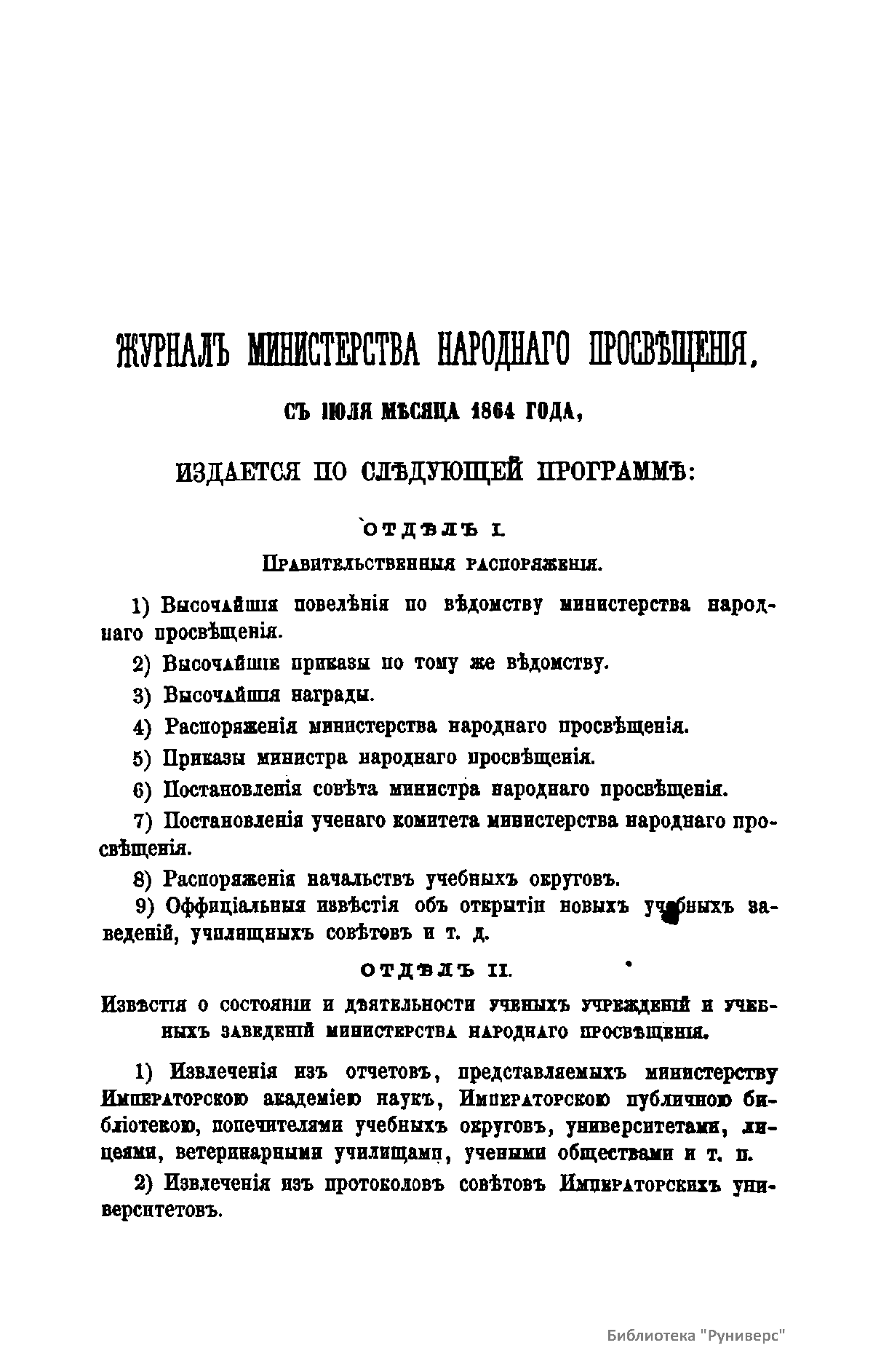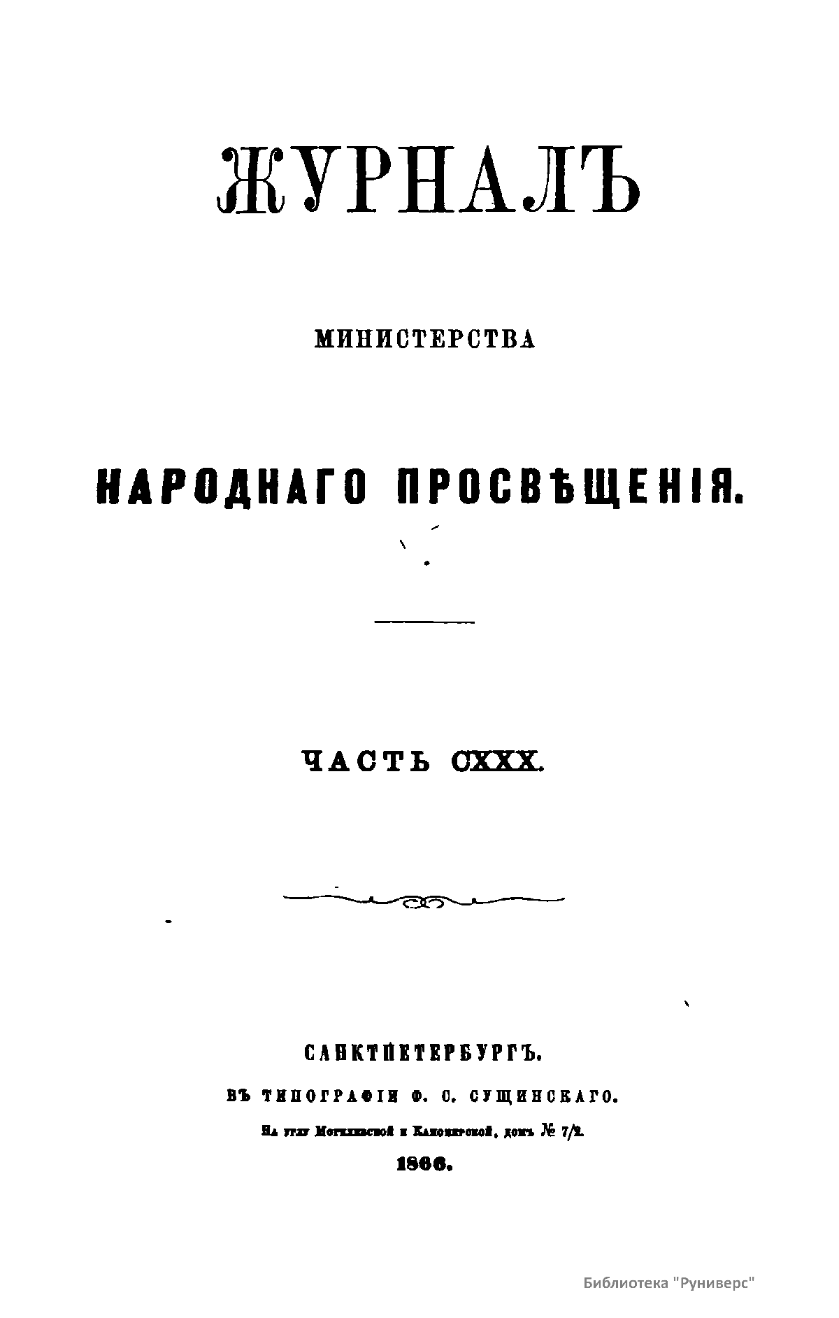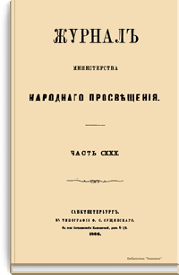 Журнал Министерства народного просвещения выходил с 1834-го по 1917 год. Официальный периодический журнал об успехах просвещения в России. Издатели журнала уверены в том, что «если для каждого человека необходим выход из грубой тьмы невежества и беспрерывное дальнейшее движение к свету, то для народов необходимо попечительное участие правительства в образовании. Только правительство имеет все средства знать и высоту успехов всемирного образования, и настоящие нужды Отечества».