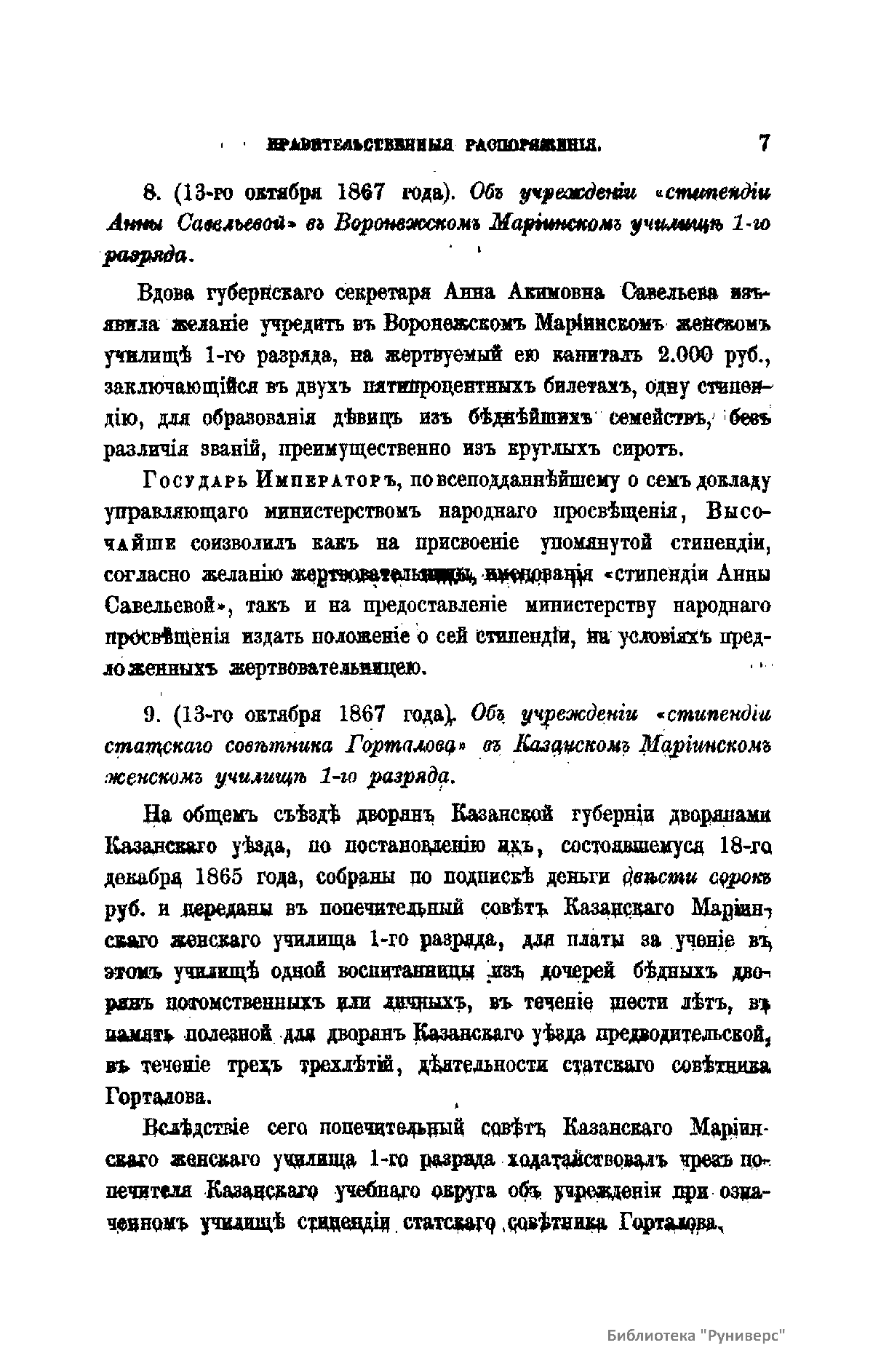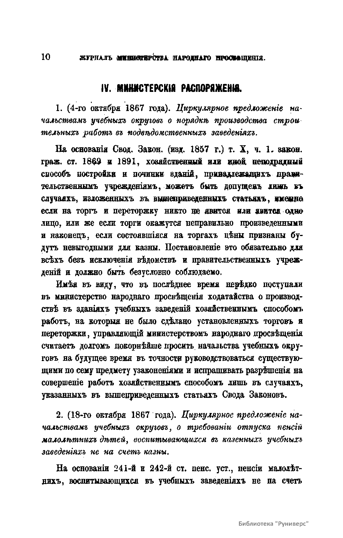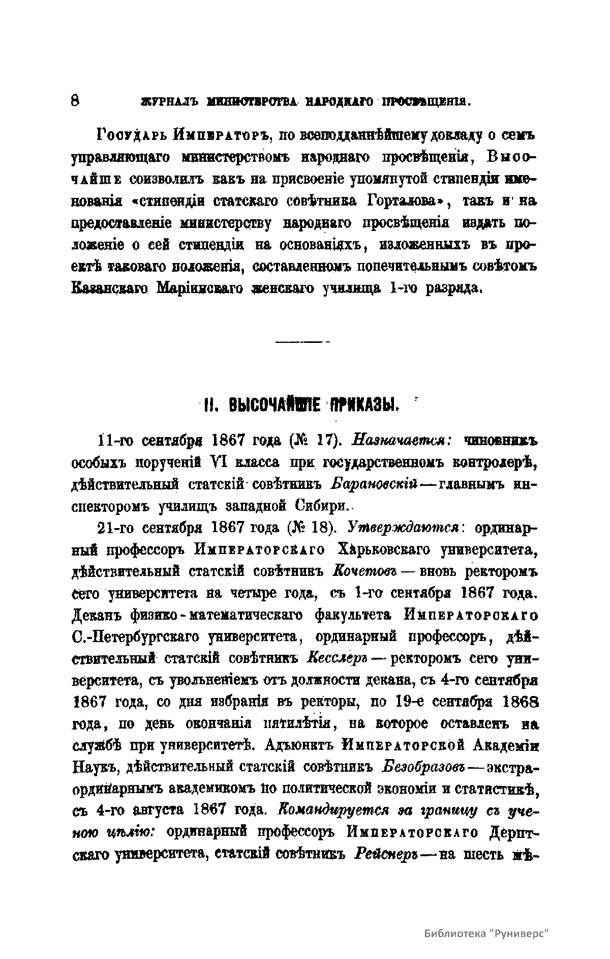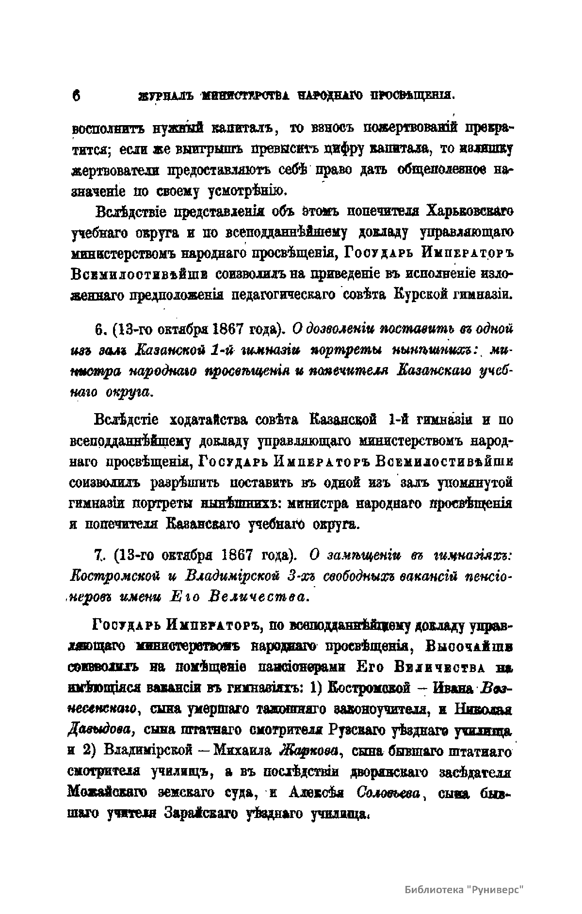 Журнал Министерства народного просвещения выходил с 1834-го по 1917 год. Официальный периодический журнал об успехах просвещения в России. Издатели журнала уверены в том, что «если для каждого человека необходим выход из грубой тьмы невежества и беспрерывное дальнейшее движение к свету, то для народов необходимо попечительное участие правительства в образовании. Только правительство имеет все средства знать и высоту успехов всемирного образования, и настоящие нужды Отечества».