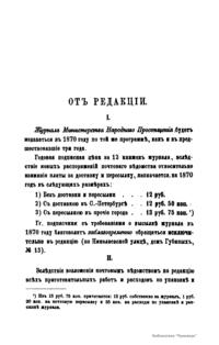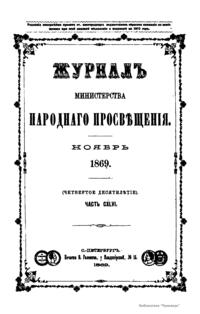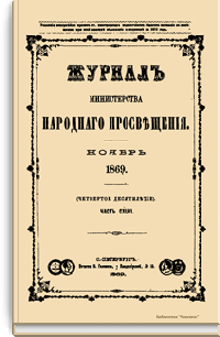 Журнал Министерства народного просвещения выходил с 1834-го по 1917 год. Официальный периодический журнал об успехах просвещения в России. Издатели журнала уверены в том, что «если для каждого человека необходим выход из грубой тьмы невежества и беспрерывное дальнейшее движение к свету, то для народов необходимо попечительное участие правительства в образовании. Только правительство имеет все средства знать и высоту успехов всемирного образования, и настоящие нужды Отечества».
