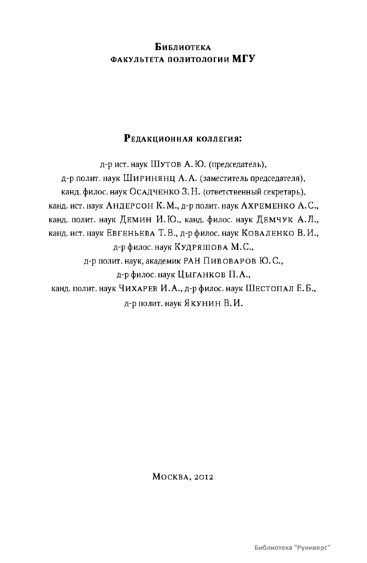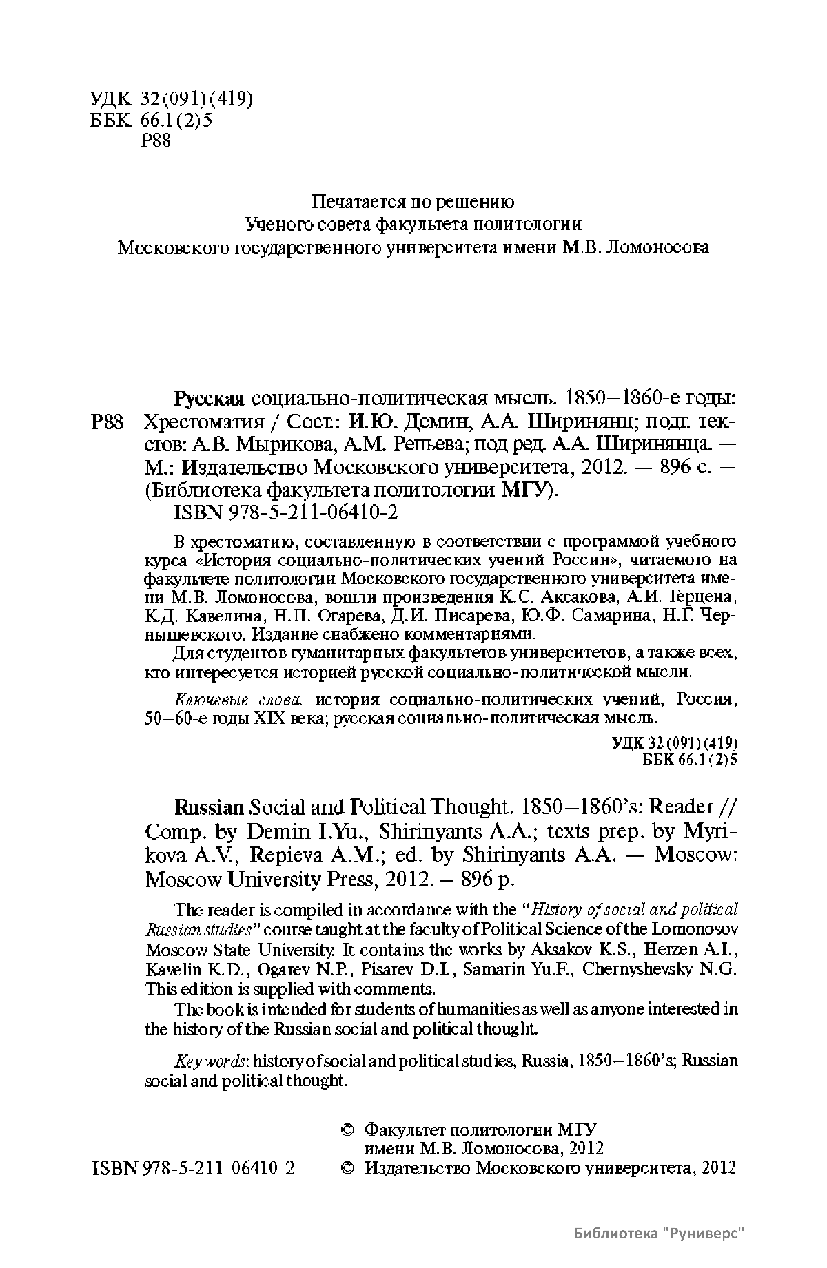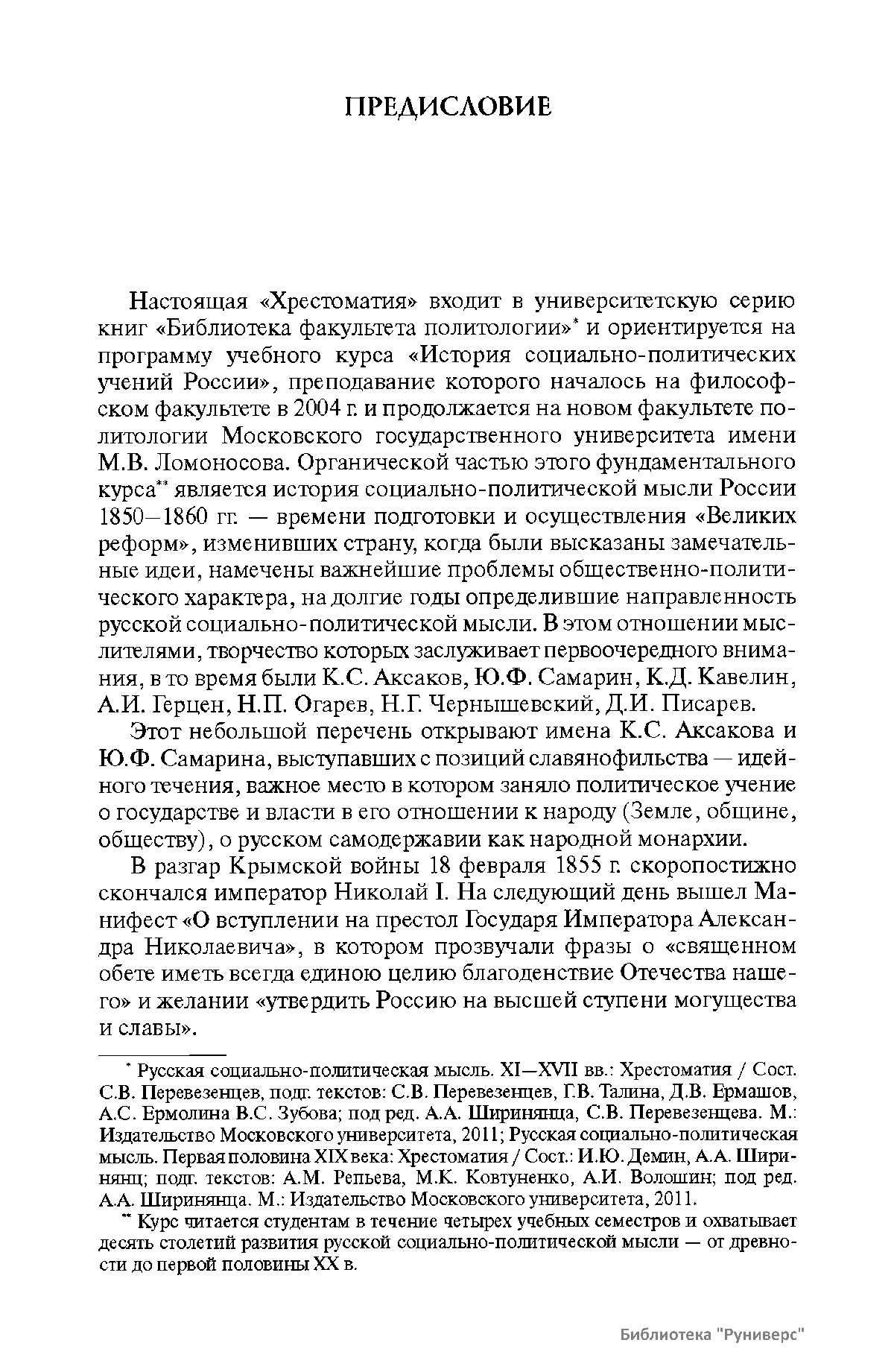 В хрестоматию, составленную в соответствии с программой учебного курса «История социально-политических учений России», читаемого на факультете политологии Московского государственного университета имени М.В. Ломоносова, вошли произведения