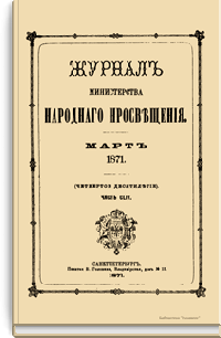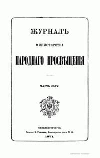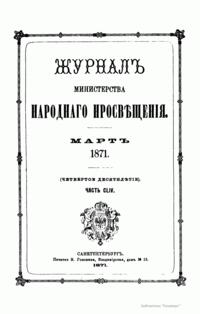 Журнал Министерства народного просвещения выходил с 1834-го по 1917 год. Официальный периодический журнал об успехах просвещения в России. Издатели журнала уверены в том, что «если для каждого человека необходим выход из грубой тьмы невежества и беспрерывное дальнейшее движение к свету, то для народов необходимо попечительное участие правительства в образовании. Только правительство имеет все средства знать и высоту успехов всемирного образования, и настоящие нужды Отечества».