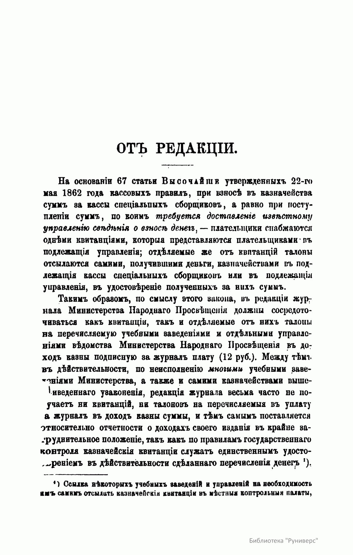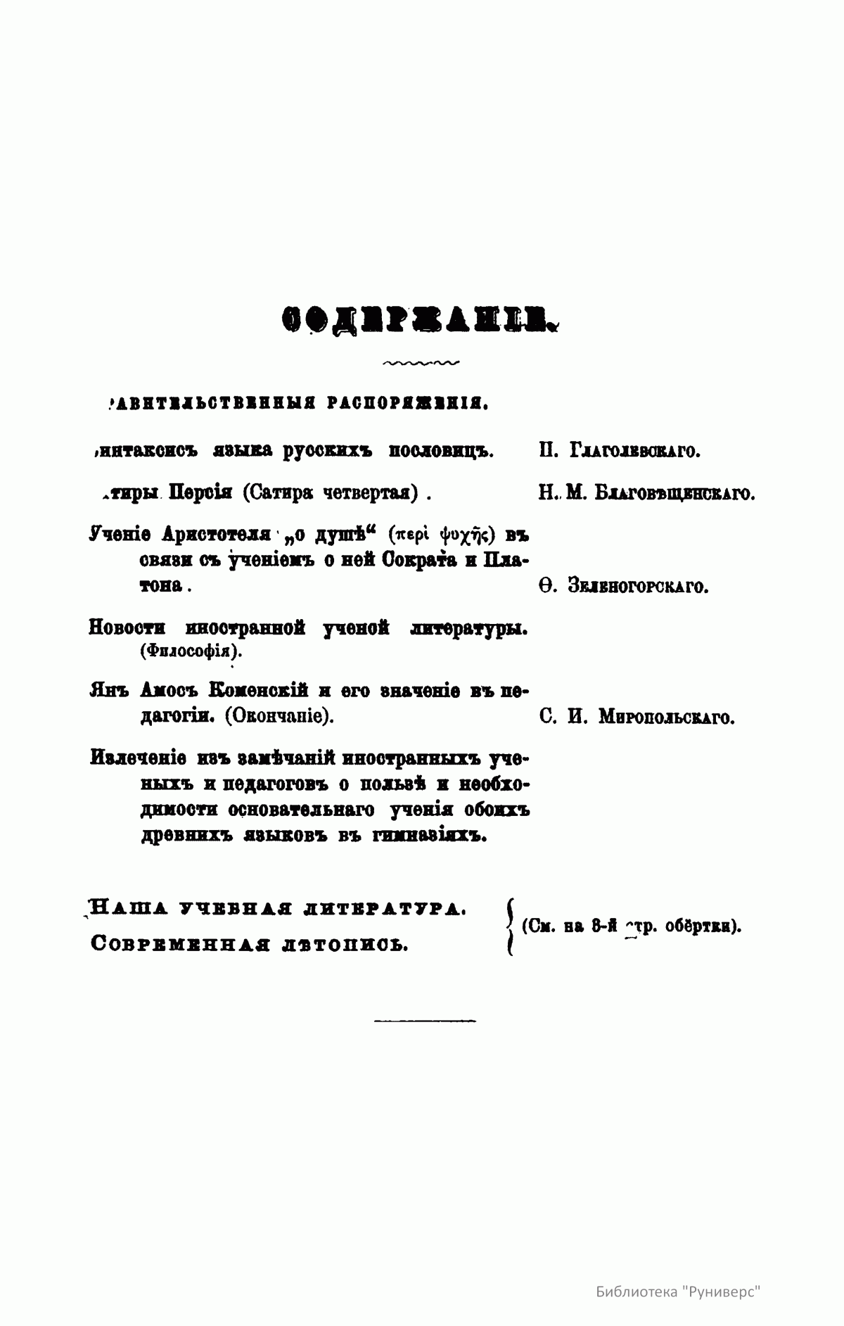 Журнал Министерства народного просвещения выходил с 1834-го по 1917 год. Официальный периодический журнал об успехах просвещения в России. Издатели журнала уверены в том, что «если для каждого человека необходим выход из грубой тьмы невежества и беспрерывное дальнейшее движение к свету, то для народов необходимо попечительное участие правительства в образовании. Только правительство имеет все средства знать и высоту успехов всемирного образования, и настоящие нужды Отечества».
