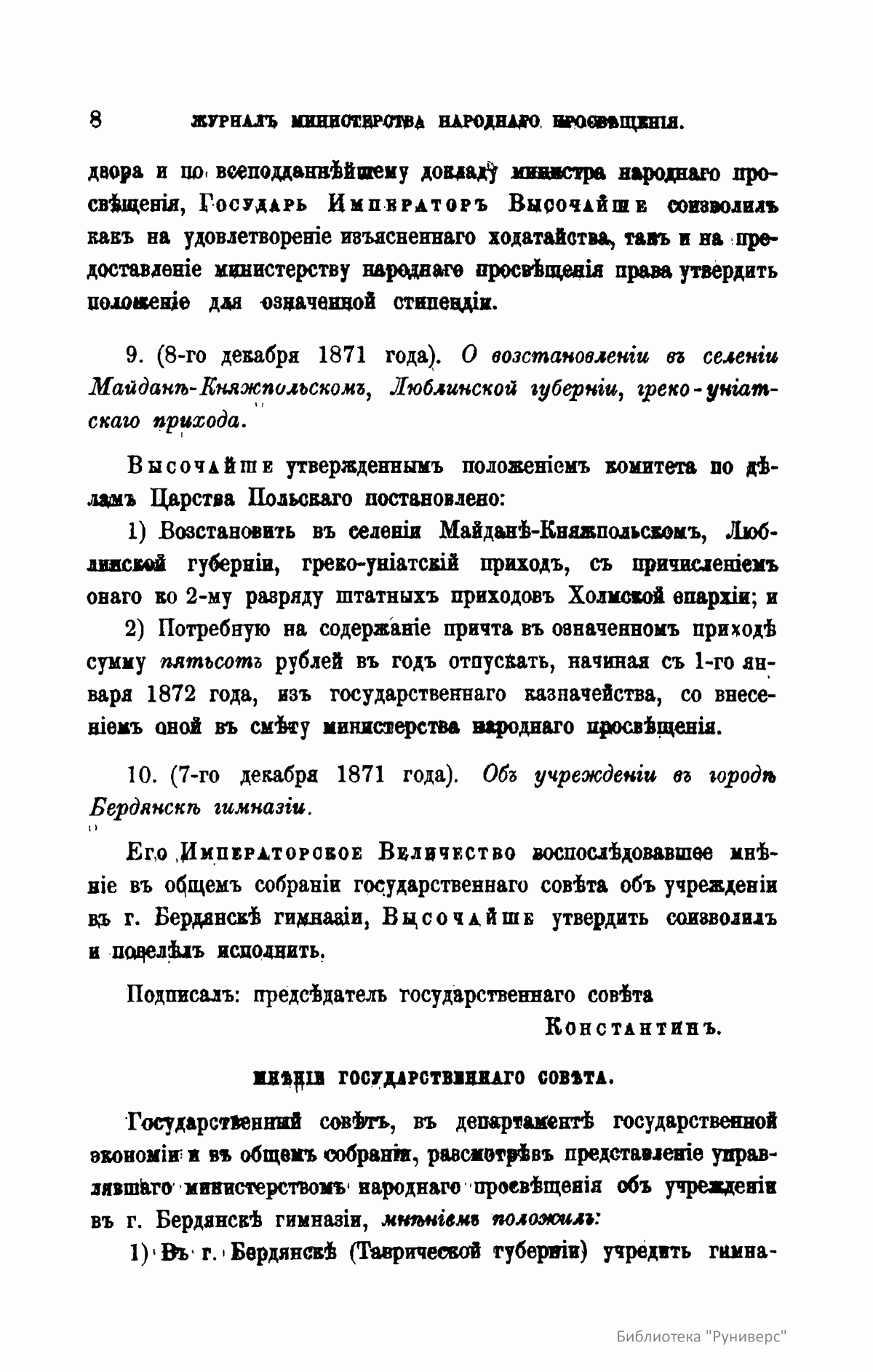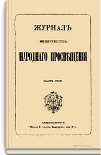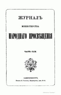 Журнал Министерства народного просвещения выходил с 1834-го по 1917 год. Официальный периодический журнал об успехах просвещения в России. Издатели журнала уверены в том, что «если для каждого человека необходим выход из грубой тьмы невежества и беспрерывное дальнейшее движение к свету, то для народов необходимо попечительное участие правительства в образовании. Только правительство имеет все средства знать и высоту успехов всемирного образования, и настоящие нужды Отечества».