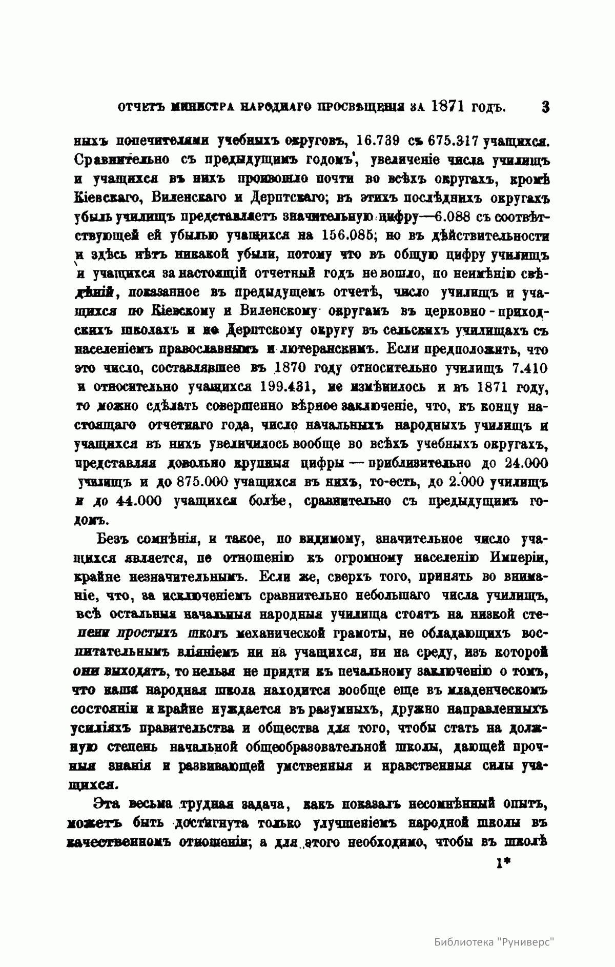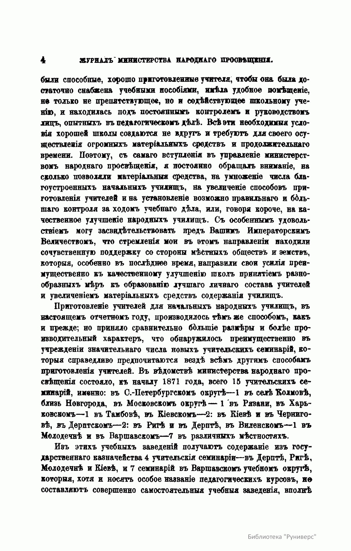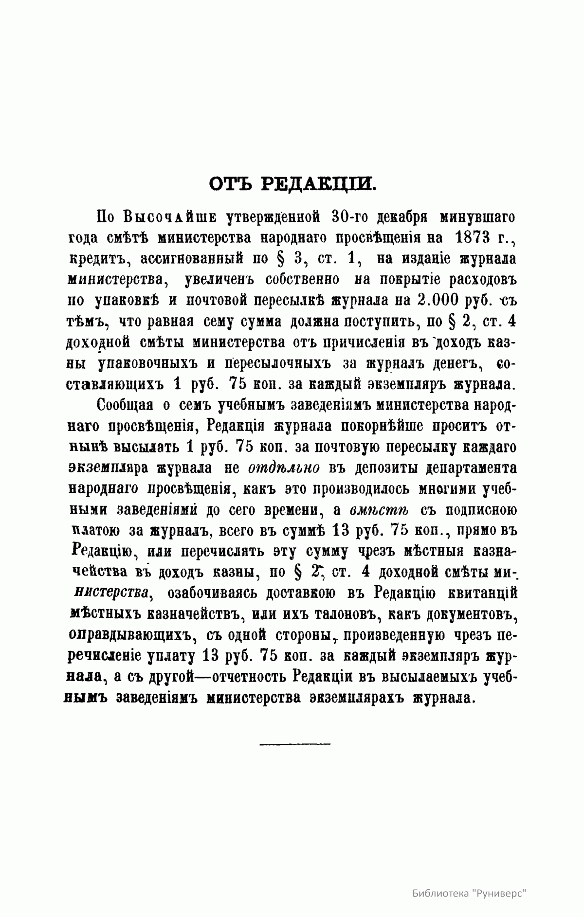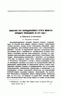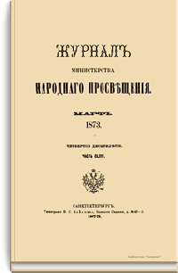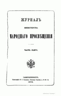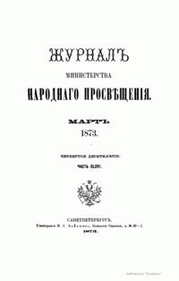Журнал Министерства народного просвещения выходил с 1834-го по 1917 год. Официальный периодический журнал об успехах просвещения в России. Издатели журнала уверены в том, что «если для каждого человека необходим выход из грубой тьмы невежества и беспрерывное дальнейшее движение к свету, то для народов необходимо попечительное участие правительства в образовании. Только правительство имеет все средства знать и высоту успехов всемирного образования, и настоящие нужды Отечества».