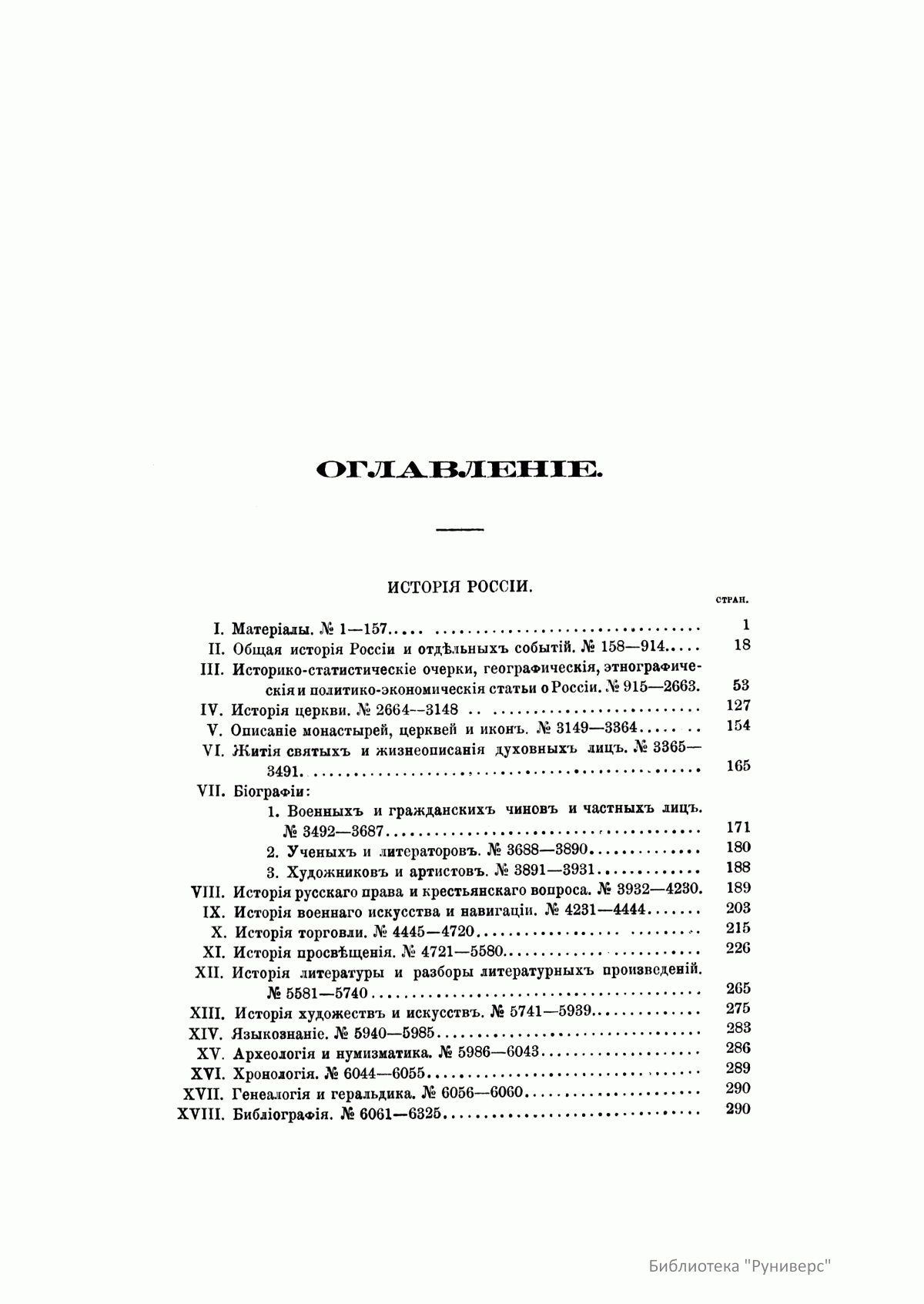 В десяти томах «Русской исторической библиографии» заключается описание свыше 44 000 книг, карт, периодических изданий, статей из журналов и газет по русской и всеобщей истории. Кроме этого, богато представлена литература о Крымской войне 1853–1856 гг., реформе 1860-х гг., польском восстании 1863–1864 гг. и о других событиях.