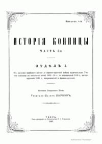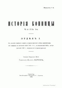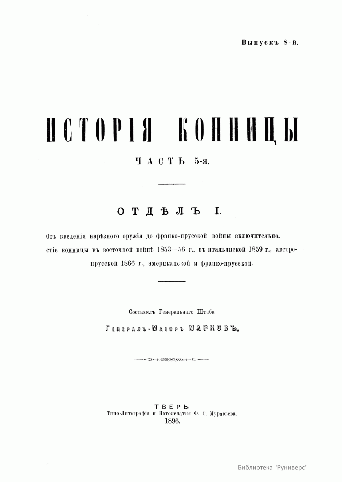 Труд по истории конницы М. И. Маркова, командира 1-го лейб-драгунского Московского его величества полка, изданный в конце XIX века в пяти томах, сегодня признан безусловной библиографической редкостью. Капитальная монография, уникальная по объему собранного материала, написана занимательным, живым языком. Издание охватывает обширный и разнообразный по своему составу материал. Изучение конницы ведется со времен ее возникновения в Древней Греции; затем рассмотрено дальнейшее развитие конных войск в Римской империи, в средневековых государствах Европы и Азии. Особенно пристальное внимание автор уделил кавалерии России от ее возникновения до детального разбора действий русской конницы во время Балканской войны 1877–1878 гг. На страницах монографии рассмотрено огромное количество сражений и битв различных государств и эпох, приведены выводы автора об устройстве конницы минувших столетий. Текст сопровождают многочисленные иллюстрации, изображающие породы и окрасы лошадей, формы обмундирования и вооружения всадников, портреты знаменитых полководцев и государственных деятелей, а также схемы и карты сражений.