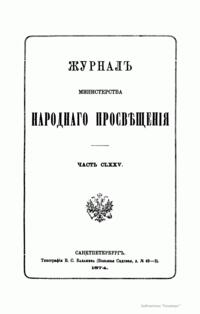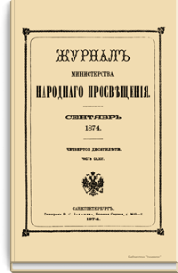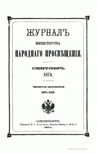 Журнал Министерства народного просвещения выходил с 1834-го по 1917 год. Официальный периодический журнал об успехах просвещения в России. Издатели журнала уверены в том, что «если для каждого человека необходим выход из грубой тьмы невежества и беспрерывное дальнейшее движение к свету, то для народов необходимо попечительное участие правительства в образовании. Только правительство имеет все средства знать и высоту успехов всемирного образования, и настоящие нужды Отечества».