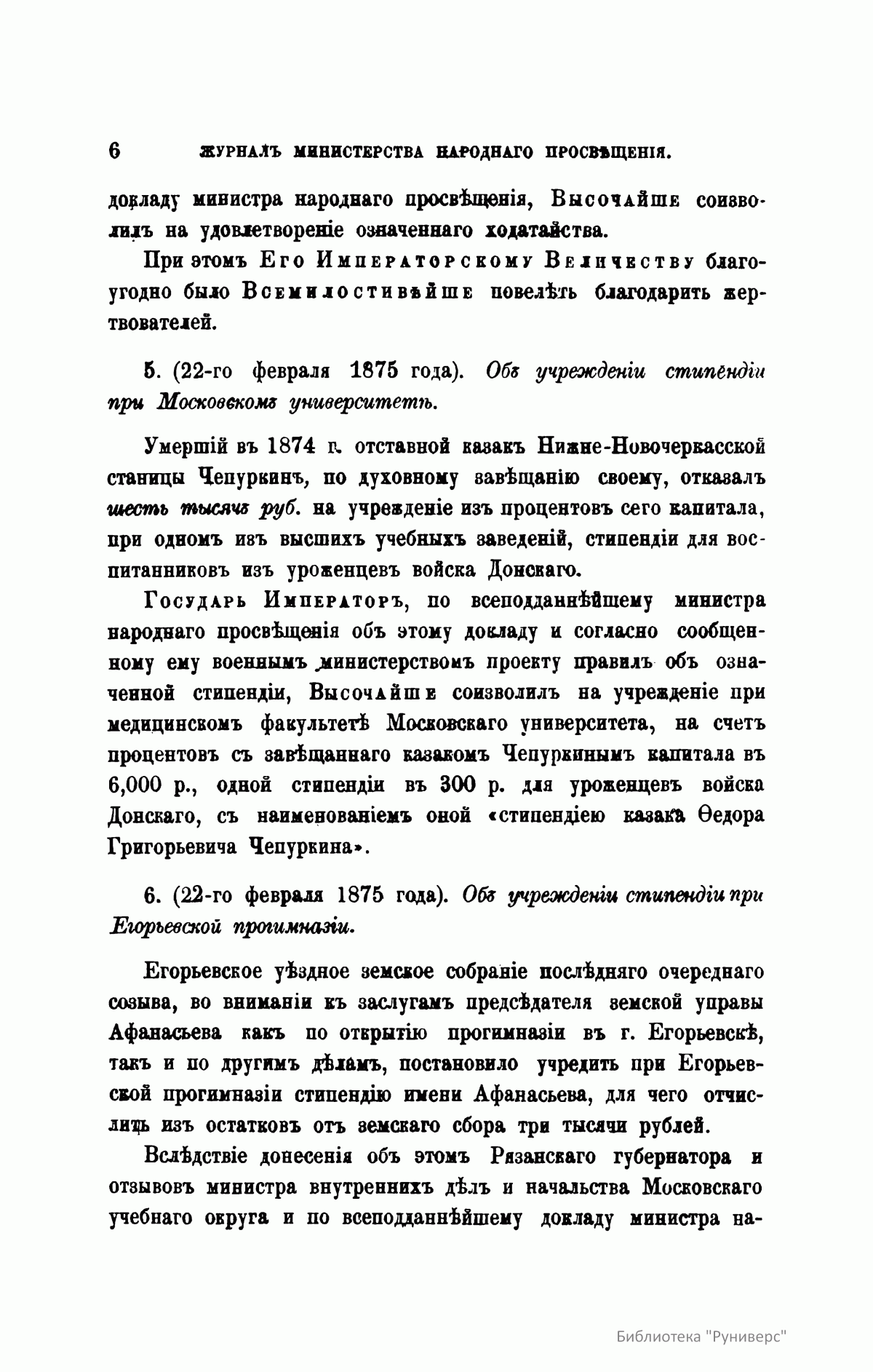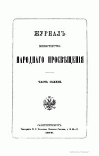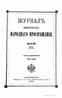 Журнал Министерства народного просвещения выходил с 1834-го по 1917 год. Официальный периодический журнал об успехах просвещения в России. Издатели журнала уверены в том, что «если для каждого человека необходим выход из грубой тьмы невежества и беспрерывное дальнейшее движение к свету, то для народов необходимо попечительное участие правительства в образовании. Только правительство имеет все средства знать и высоту успехов всемирного образования, и настоящие нужды Отечества».