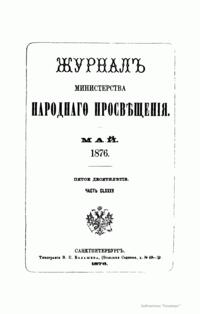 Журнал Министерства народного просвещения выходил с 1834-го по 1917 год. Официальный периодический журнал об успехах просвещения в России. Издатели журнала уверены в том, что «если для каждого человека необходим выход из грубой тьмы невежества и беспрерывное дальнейшее движение к свету, то для народов необходимо попечительное участие правительства в образовании. Только правительство имеет все средства знать и высоту успехов всемирного образования, и настоящие нужды Отечества».