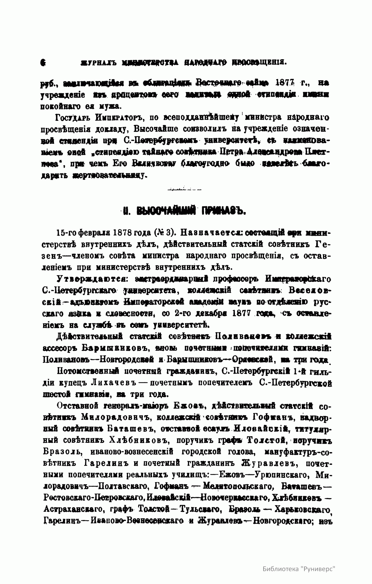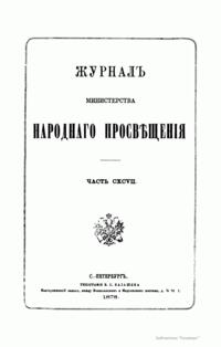 Журнал Министерства народного просвещения выходил с 1834-го по 1917 год. Официальный периодический журнал об успехах просвещения в России. Издатели журнала уверены в том, что «если для каждого человека необходим выход из грубой тьмы невежества и беспрерывное дальнейшее движение к свету, то для народов необходимо попечительное участие правительства в образовании. Только правительство имеет все средства знать и высоту успехов всемирного образования, и настоящие нужды Отечества».