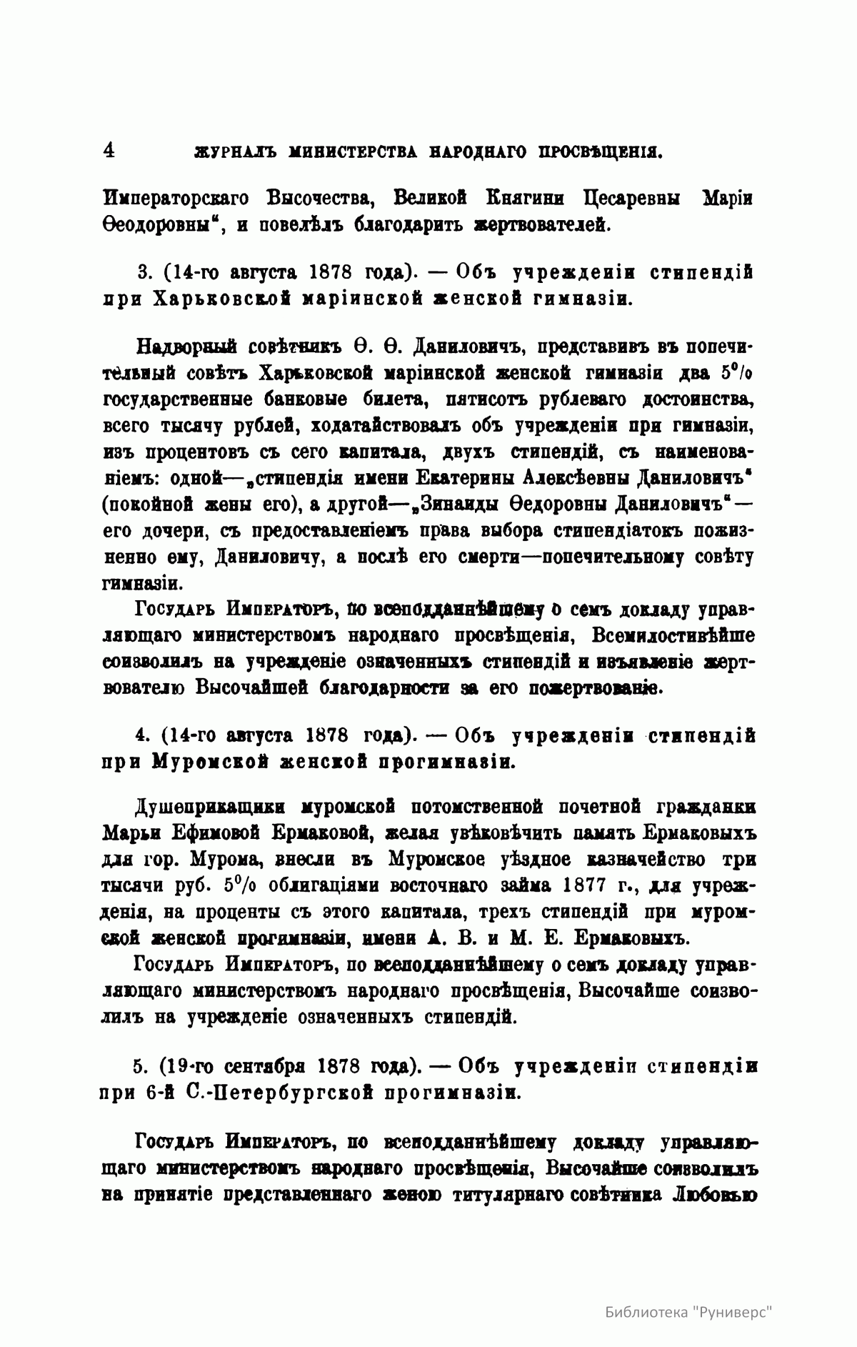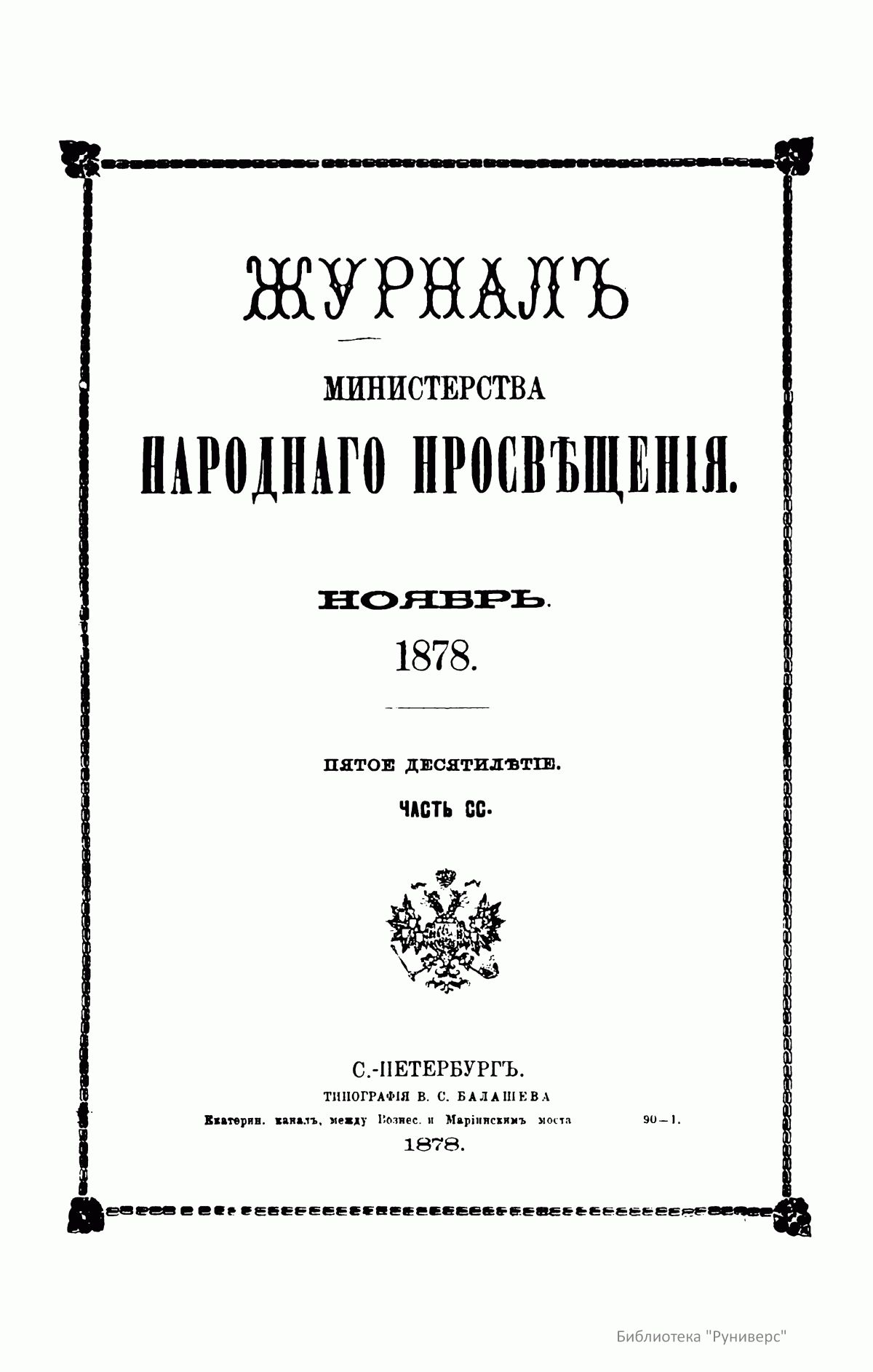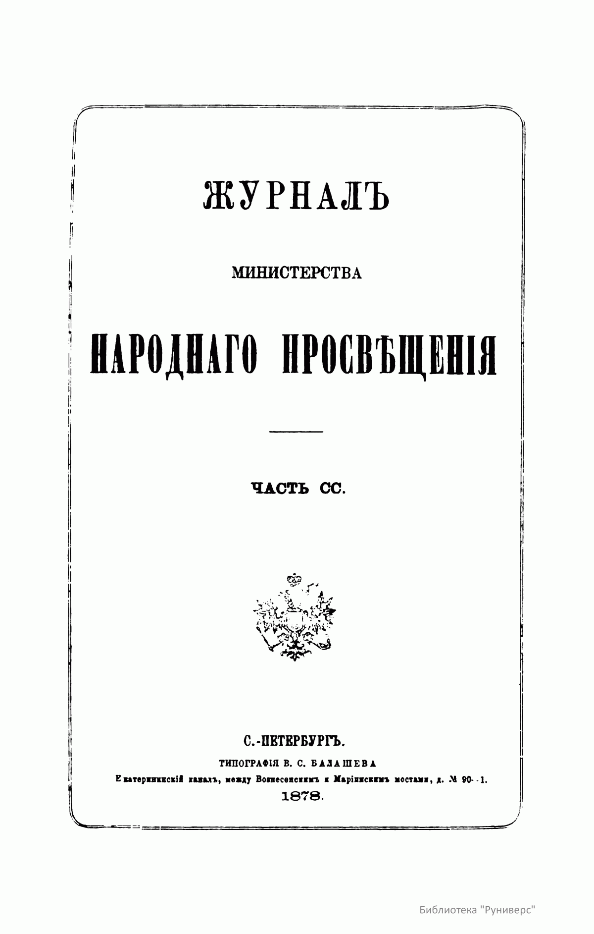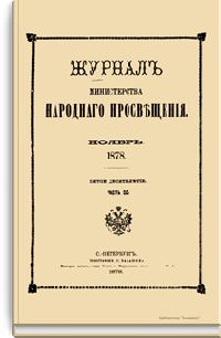 Журнал Министерства народного просвещения выходил с 1834-го по 1917 год. Официальный периодический журнал об успехах просвещения в России. Издатели журнала уверены в том, что «если для каждого человека необходим выход из грубой тьмы невежества и беспрерывное дальнейшее движение к свету, то для народов необходимо попечительное участие правительства в образовании. Только правительство имеет все средства знать и высоту успехов всемирного образования, и настоящие нужды Отечества».