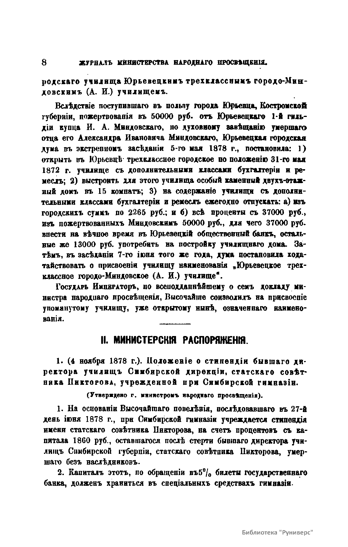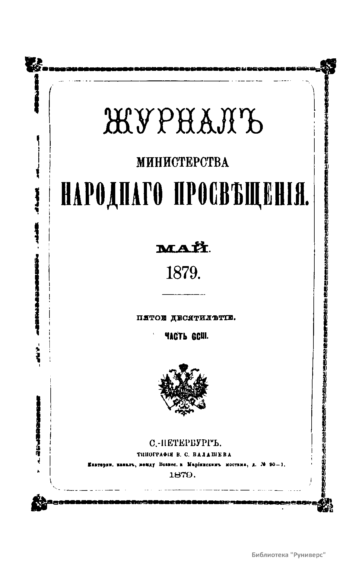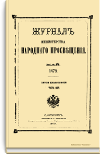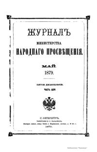 Журнал Министерства народного просвещения выходил с 1834-го по 1917 год. Официальный периодический журнал об успехах просвещения в России. Издатели журнала уверены в том, что «если для каждого человека необходим выход из грубой тьмы невежества и беспрерывное дальнейшее движение к свету, то для народов необходимо попечительное участие правительства в образовании. Только правительство имеет все средства знать и высоту успехов всемирного образования, и настоящие нужды Отечества».
