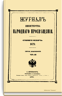 Журнал Министерства народного просвещения выходил с 1834-го по 1917 год. Официальный периодический журнал об успехах просвещения в России. Издатели журнала уверены в том, что «если для каждого человека необходим выход из грубой тьмы невежества и беспрерывное дальнейшее движение к свету, то для народов необходимо попечительное участие правительства в образовании. Только правительство имеет все средства знать и высоту успехов всемирного образования, и настоящие нужды Отечества».