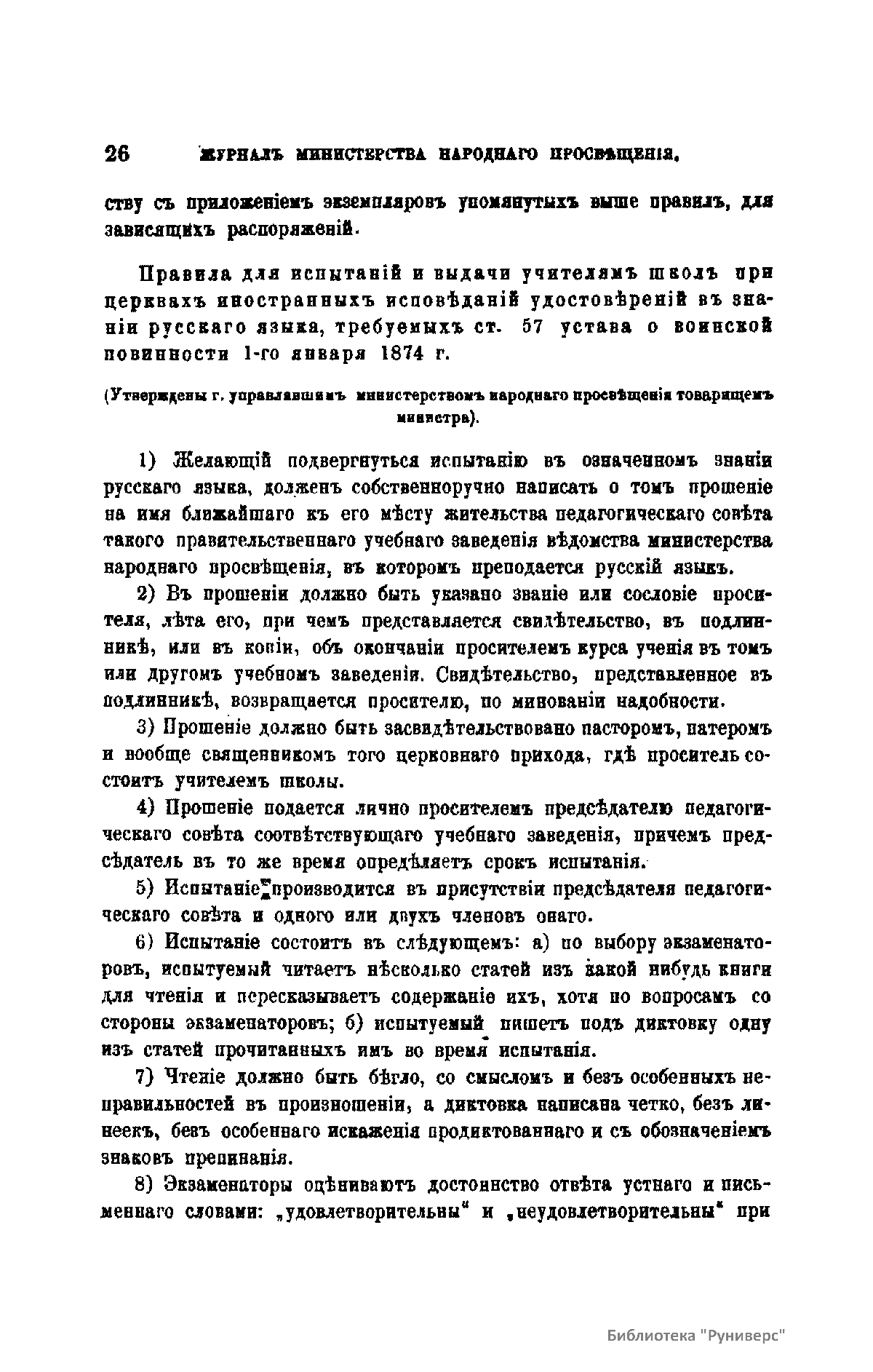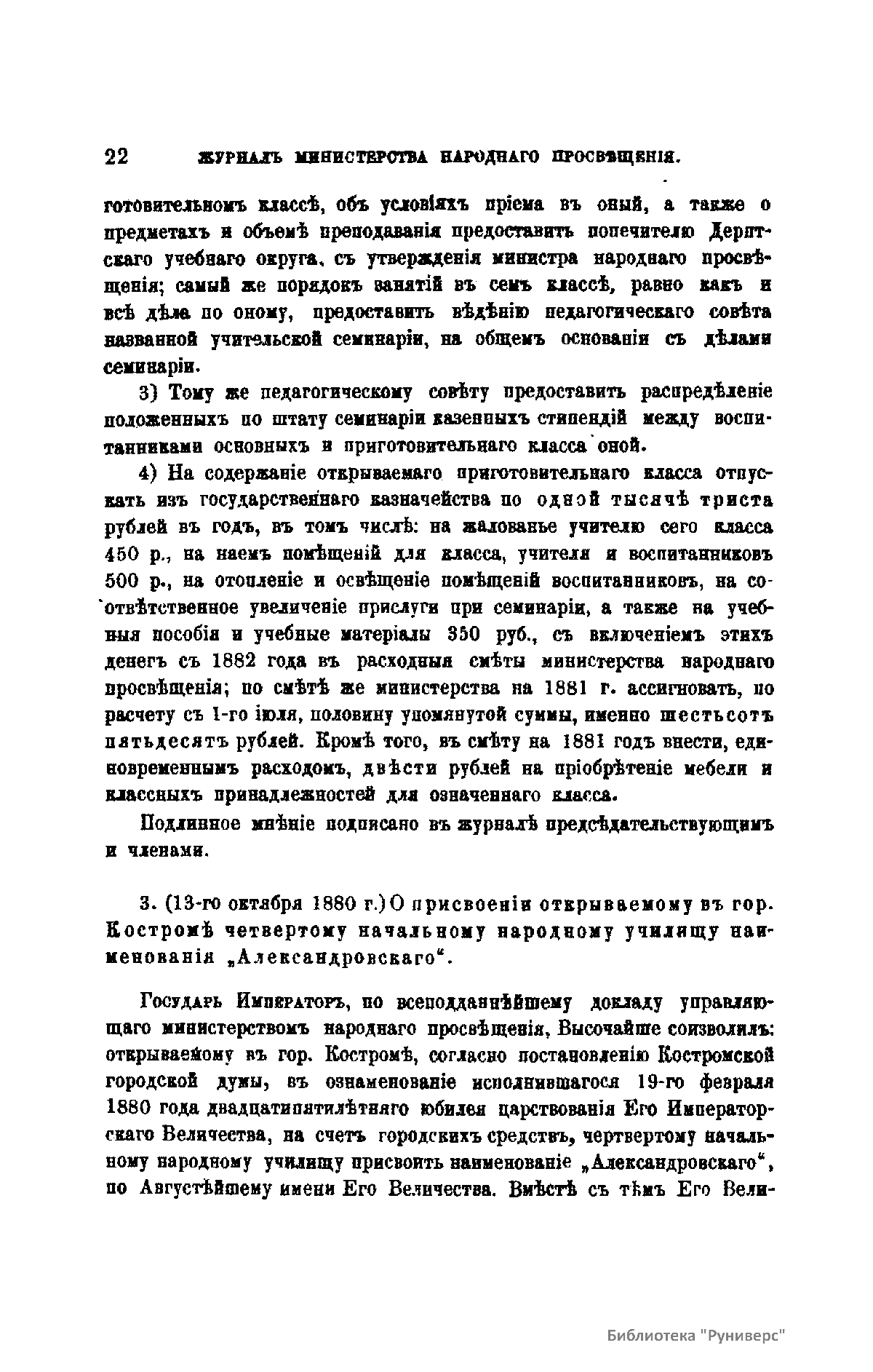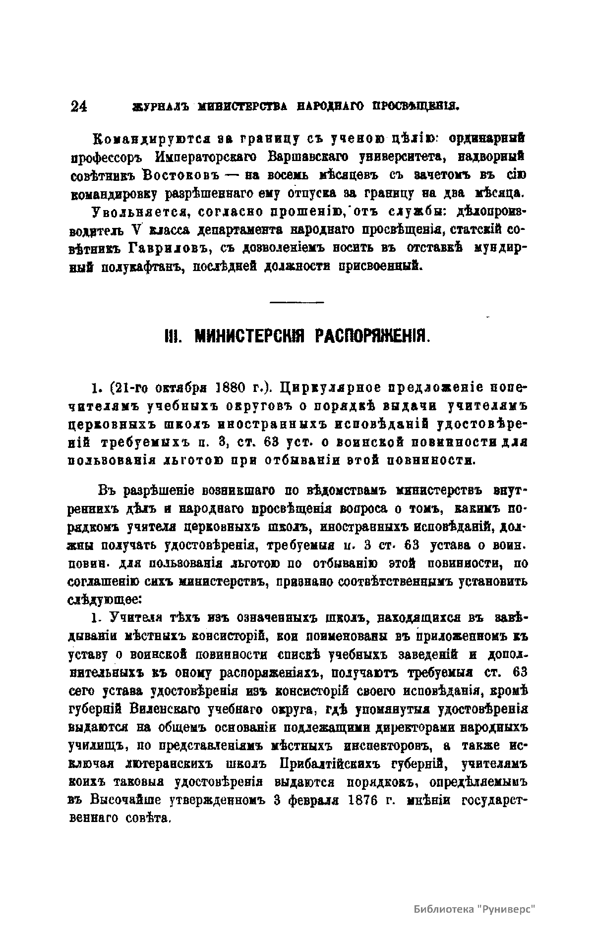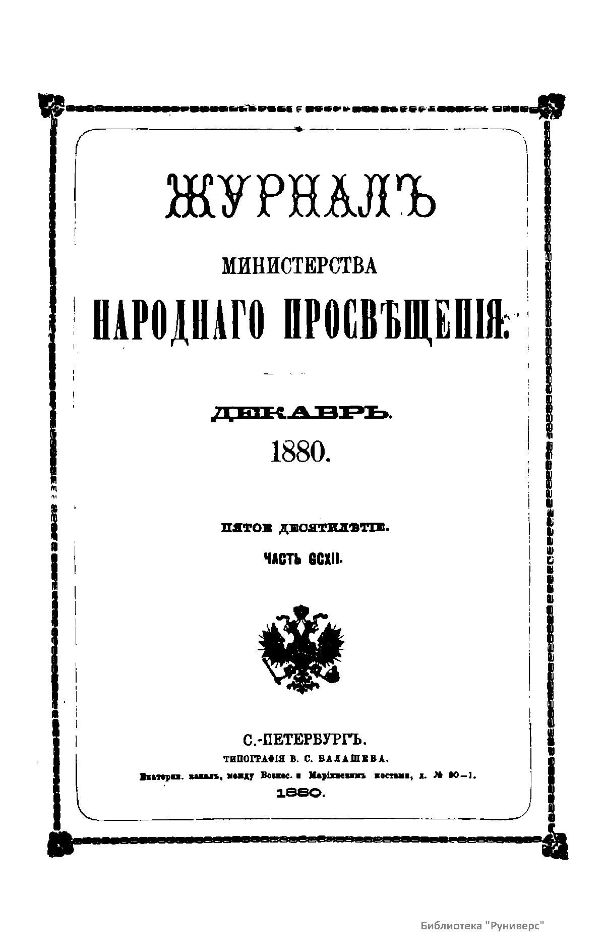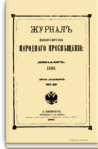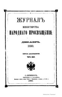Журнал Министерства народного просвещения выходил с 1834-го по 1917 год. Официальный периодический журнал об успехах просвещения в России. Издатели журнала уверены в том, что «если для каждого человека необходим выход из грубой тьмы невежества и беспрерывное дальнейшее движение к свету, то для народов необходимо попечительное участие правительства в образовании. Только правительство имеет все средства знать и высоту успехов всемирного образования, и настоящие нужды Отечества».