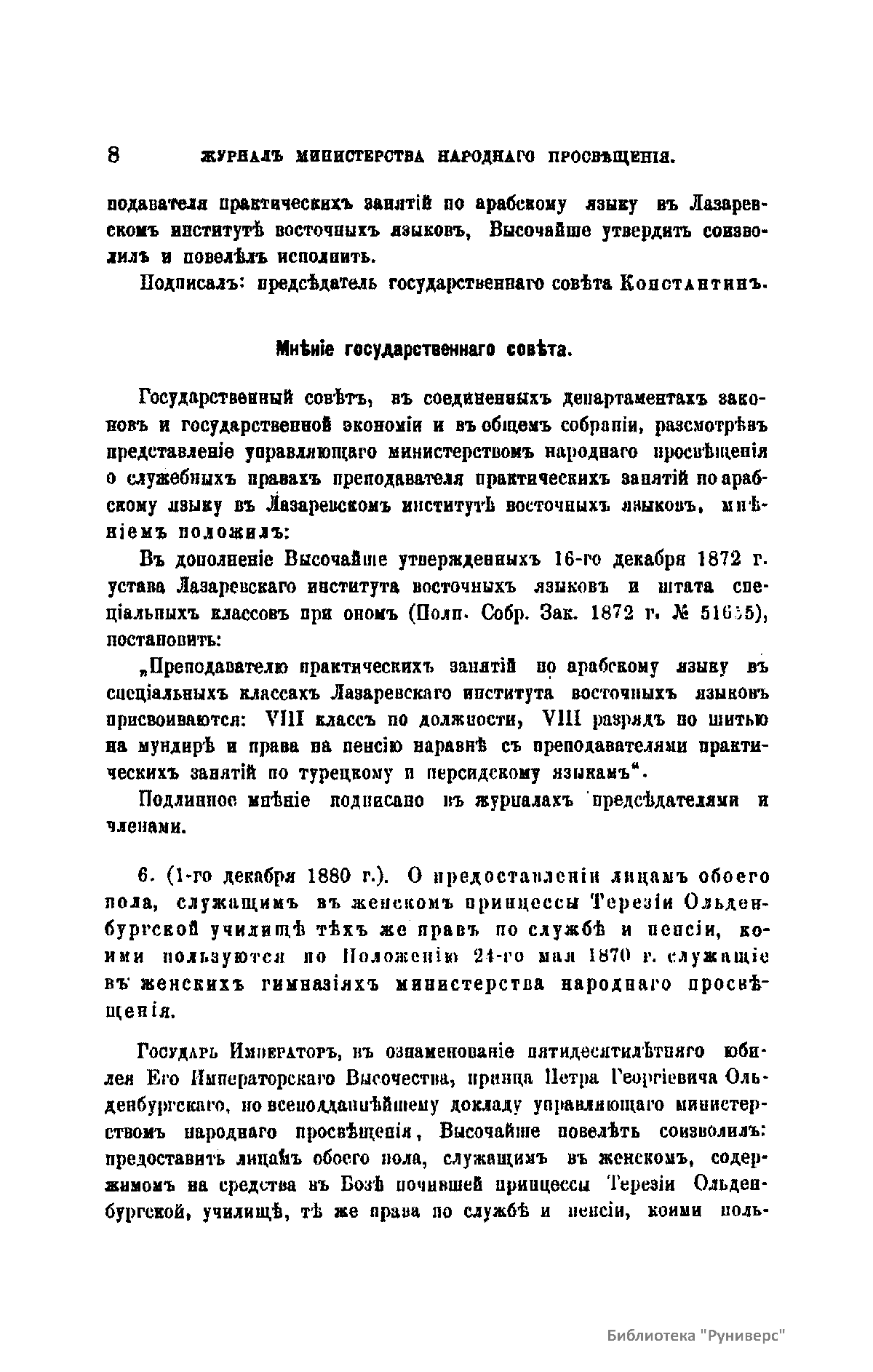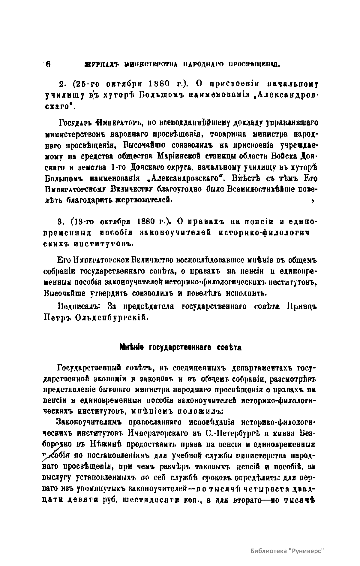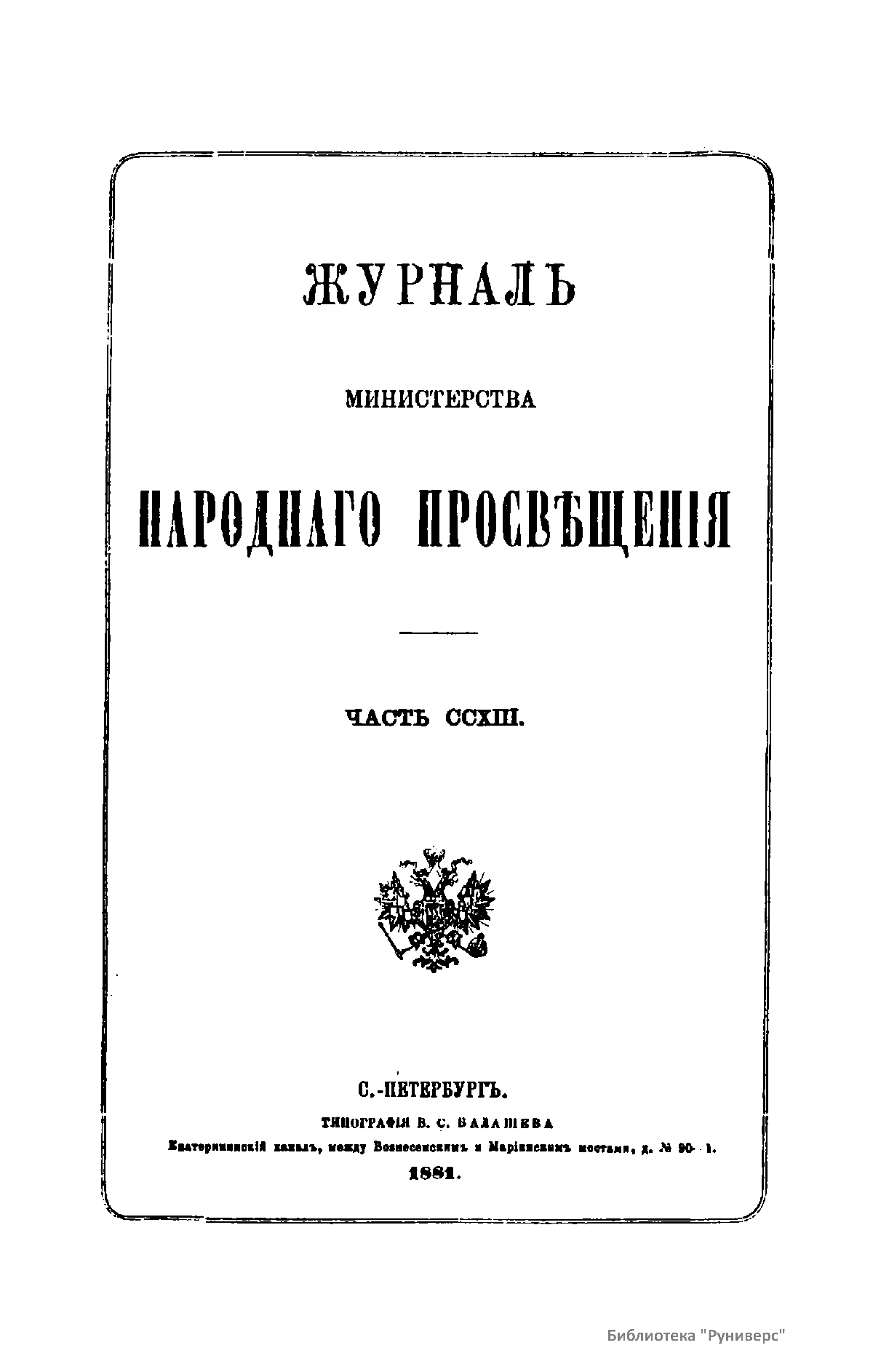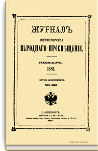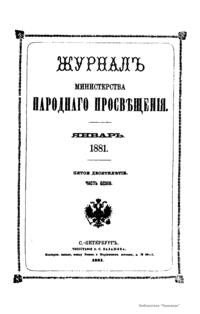 Журнал Министерства народного просвещения выходил с 1834-го по 1917 год. Официальный периодический журнал об успехах просвещения в России. Издатели журнала уверены в том, что «если для каждого человека необходим выход из грубой тьмы невежества и беспрерывное дальнейшее движение к свету, то для народов необходимо попечительное участие правительства в образовании. Только правительство имеет все средства знать и высоту успехов всемирного образования, и настоящие нужды Отечества».