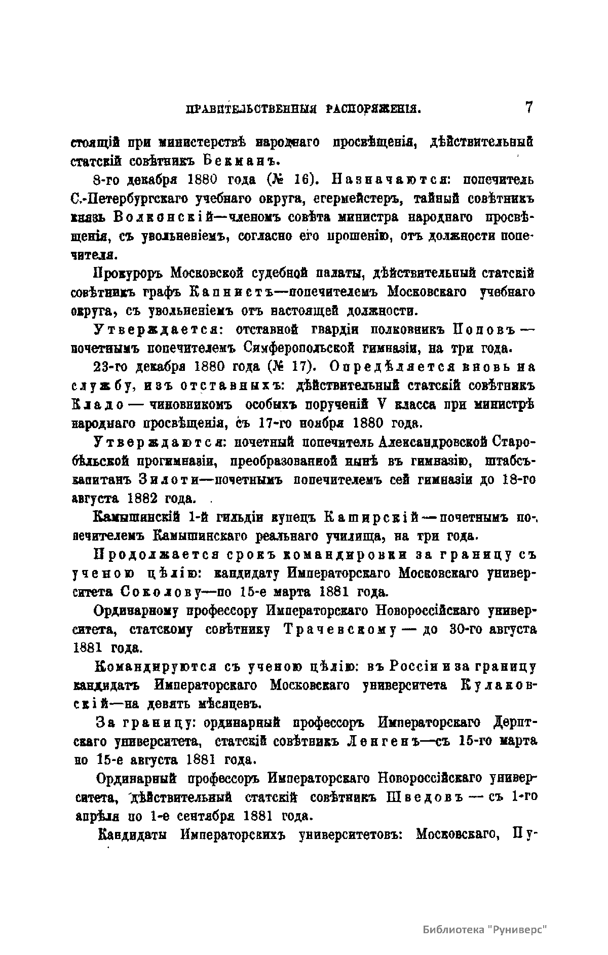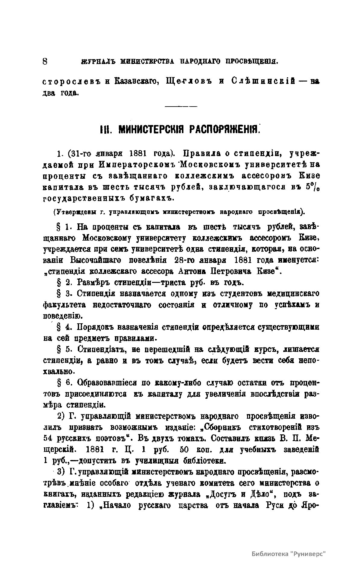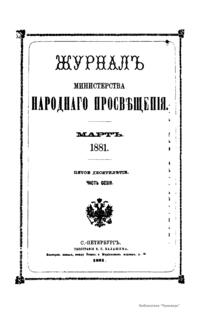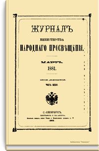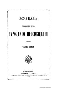 Журнал Министерства народного просвещения выходил с 1834-го по 1917 год. Официальный периодический журнал об успехах просвещения в России. Издатели журнала уверены в том, что «если для каждого человека необходим выход из грубой тьмы невежества и беспрерывное дальнейшее движение к свету, то для народов необходимо попечительное участие правительства в образовании. Только правительство имеет все средства знать и высоту успехов всемирного образования, и настоящие нужды Отечества».