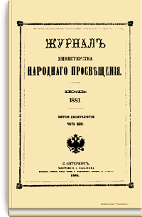 Журнал Министерства народного просвещения выходил с 1834-го по 1917 год. Официальный периодический журнал об успехах просвещения в России. Издатели журнала уверены в том, что «если для каждого человека необходим выход из грубой тьмы невежества и беспрерывное дальнейшее движение к свету, то для народов необходимо попечительное участие правительства в образовании. Только правительство имеет все средства знать и высоту успехов всемирного образования, и настоящие нужды Отечества».