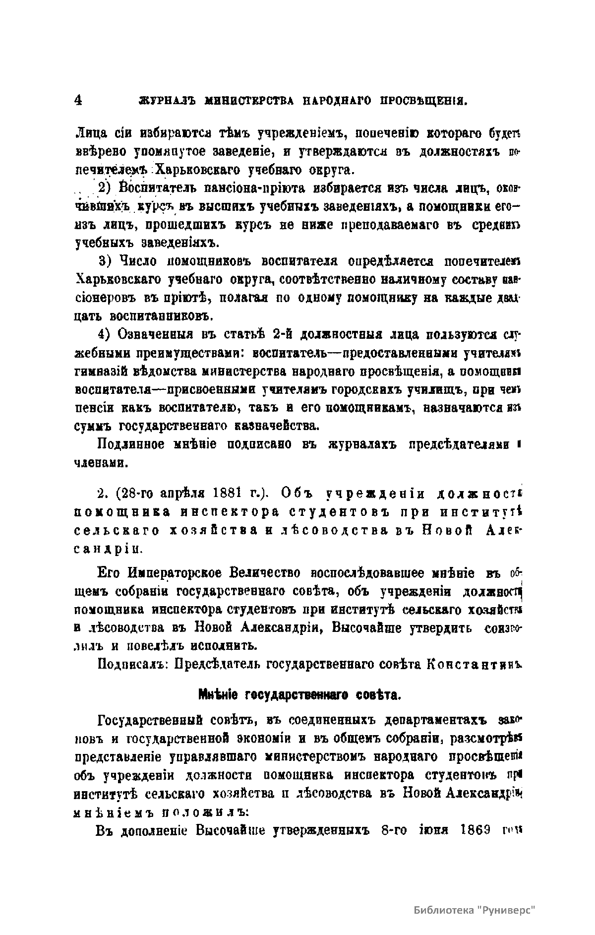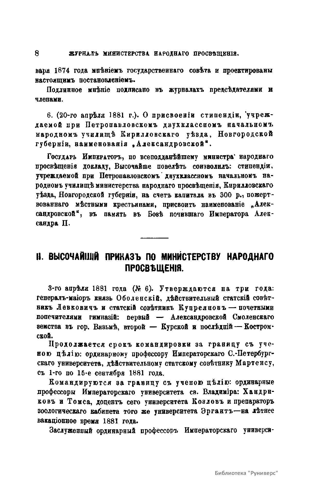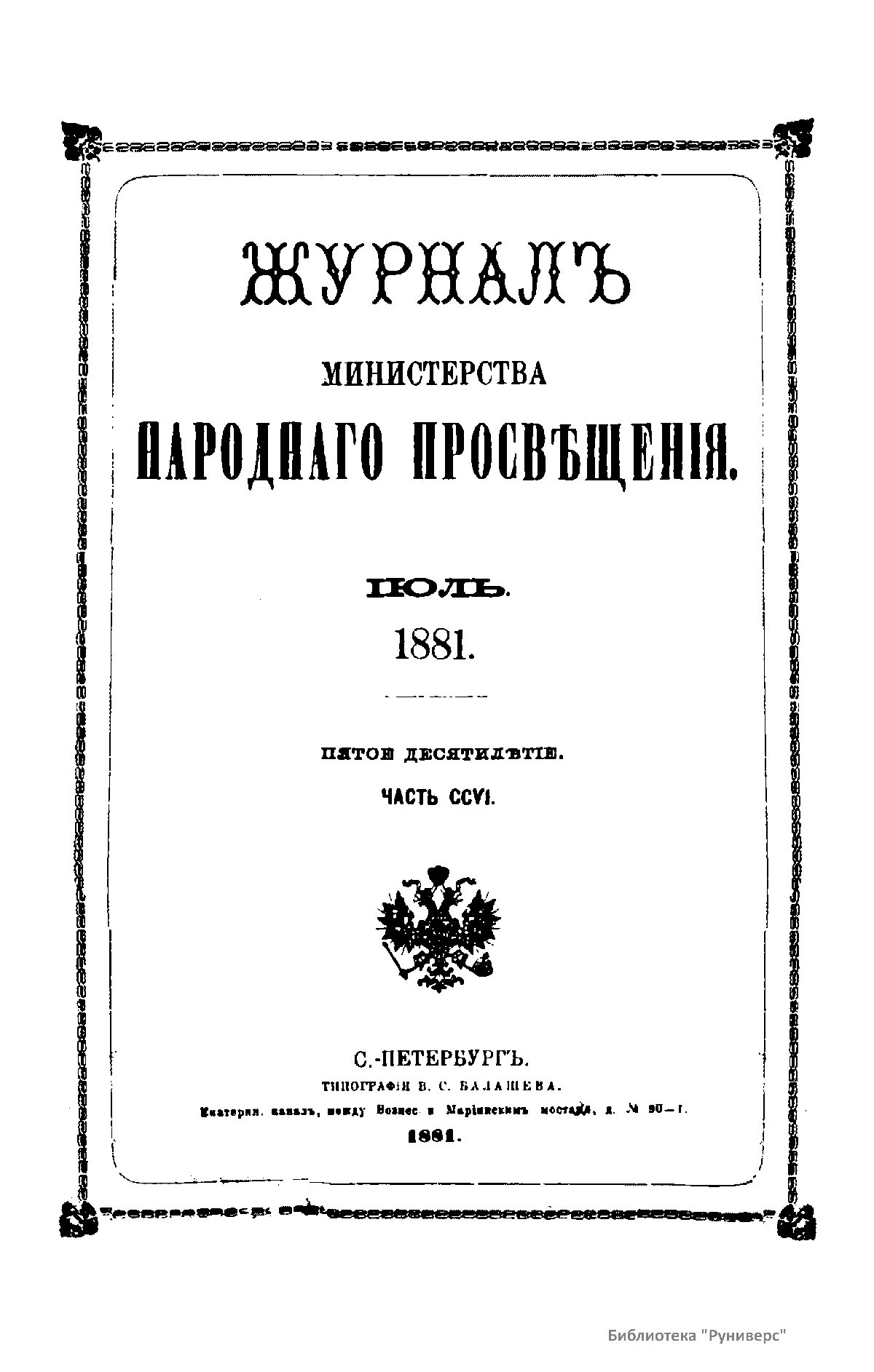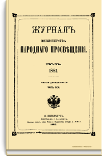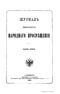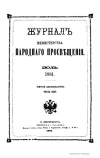 Журнал Министерства народного просвещения выходил с 1834-го по 1917 год. Официальный периодический журнал об успехах просвещения в России. Издатели журнала уверены в том, что «если для каждого человека необходим выход из грубой тьмы невежества и беспрерывное дальнейшее движение к свету, то для народов необходимо попечительное участие правительства в образовании. Только правительство имеет все средства знать и высоту успехов всемирного образования, и настоящие нужды Отечества».
