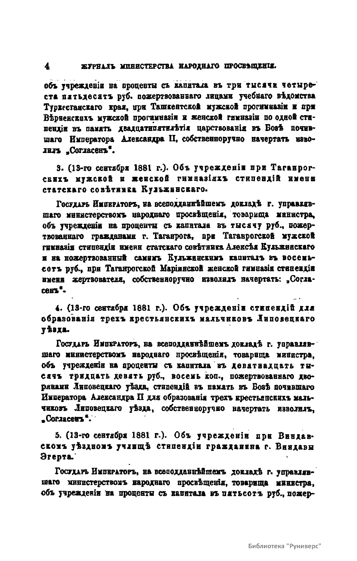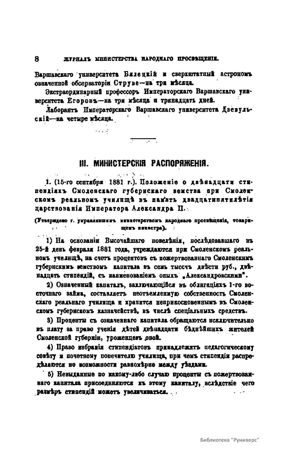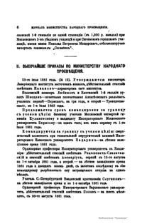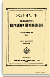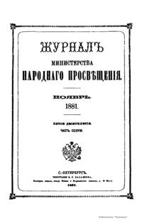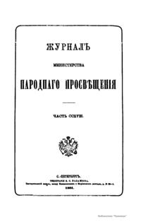 Журнал Министерства народного просвещения выходил с 1834-го по 1917 год. Официальный периодический журнал об успехах просвещения в России. Издатели журнала уверены в том, что «если для каждого человека необходим выход из грубой тьмы невежества и беспрерывное дальнейшее движение к свету, то для народов необходимо попечительное участие правительства в образовании. Только правительство имеет все средства знать и высоту успехов всемирного образования, и настоящие нужды Отечества».