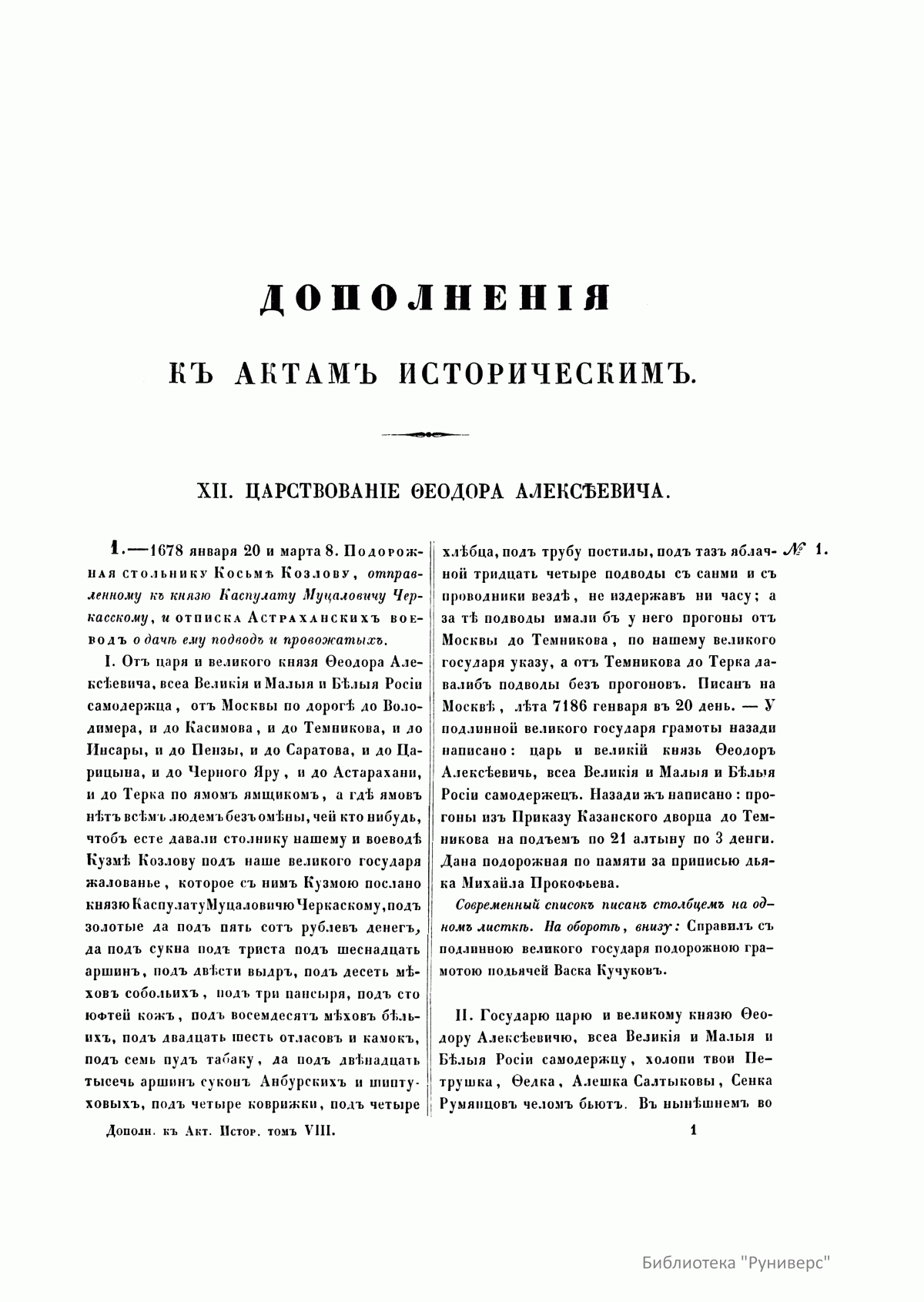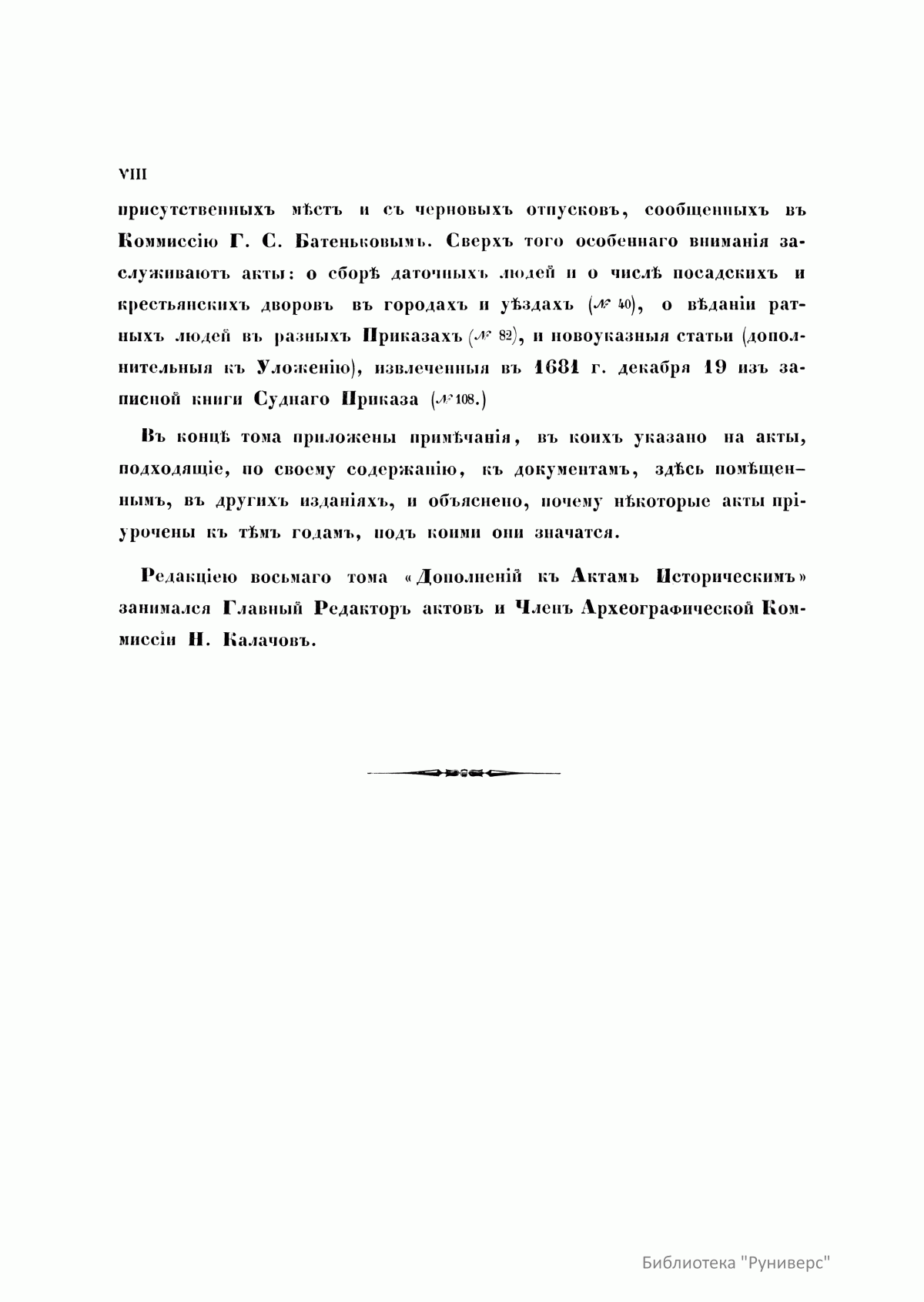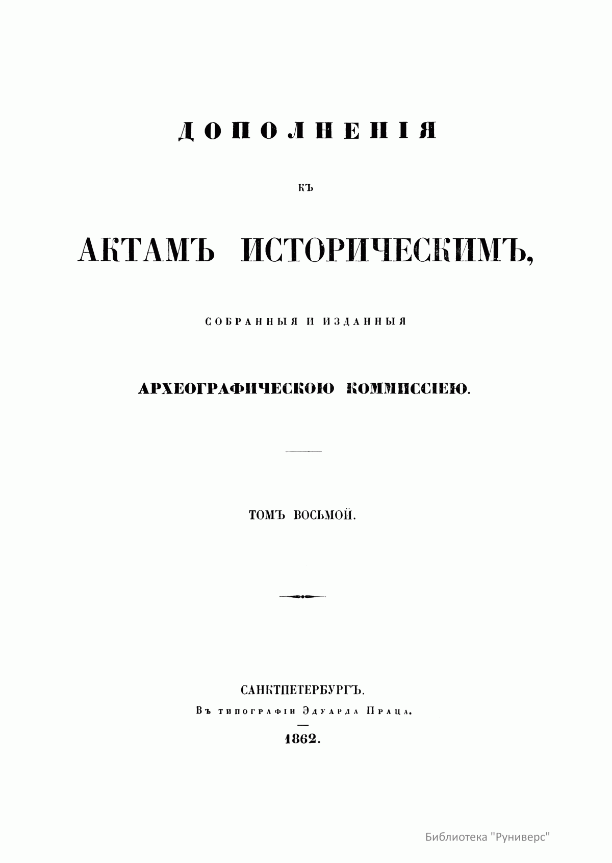 Дополненiя къ актамъ историческимъ, собранныя и изданныя археографическою коммиссiею. Томъ восьмой