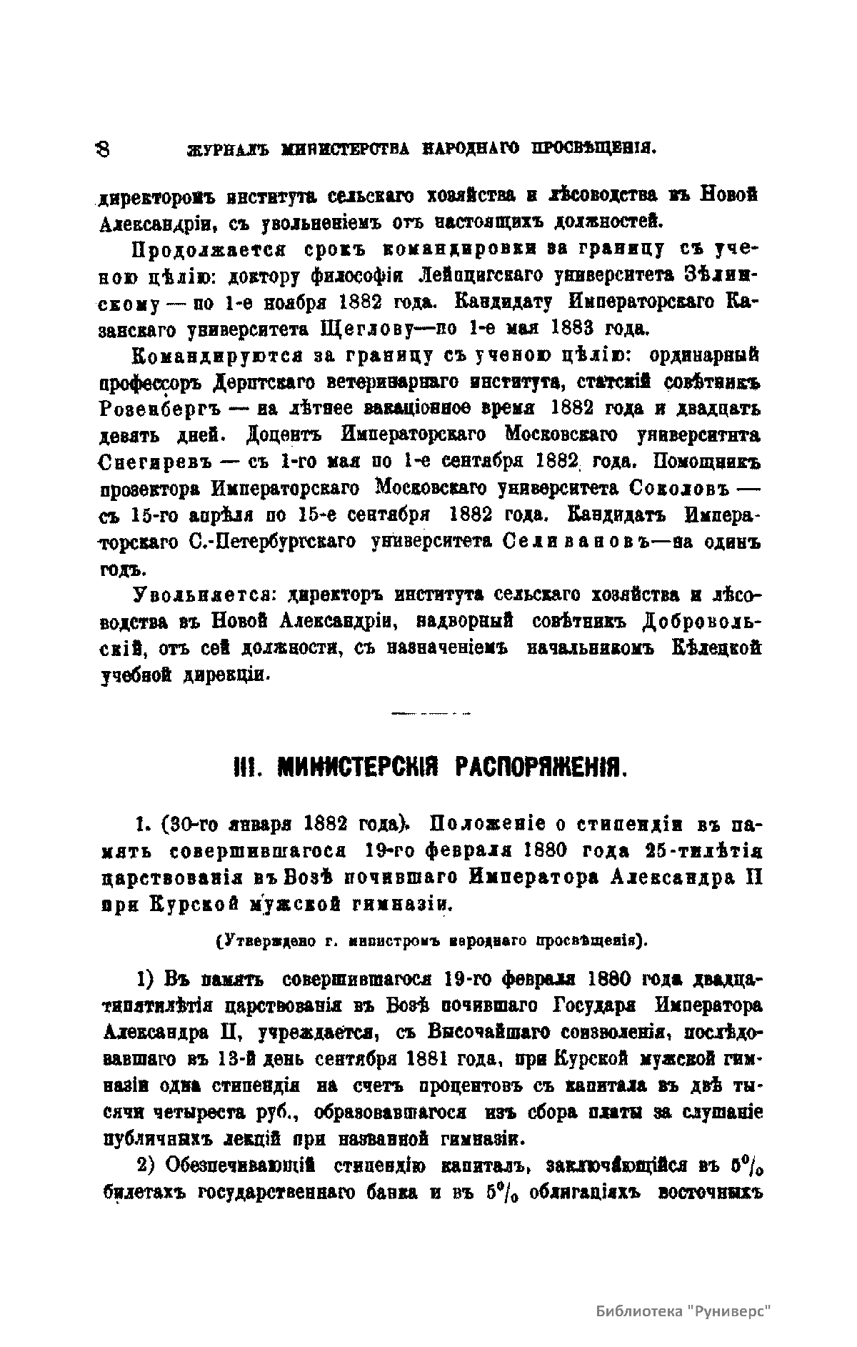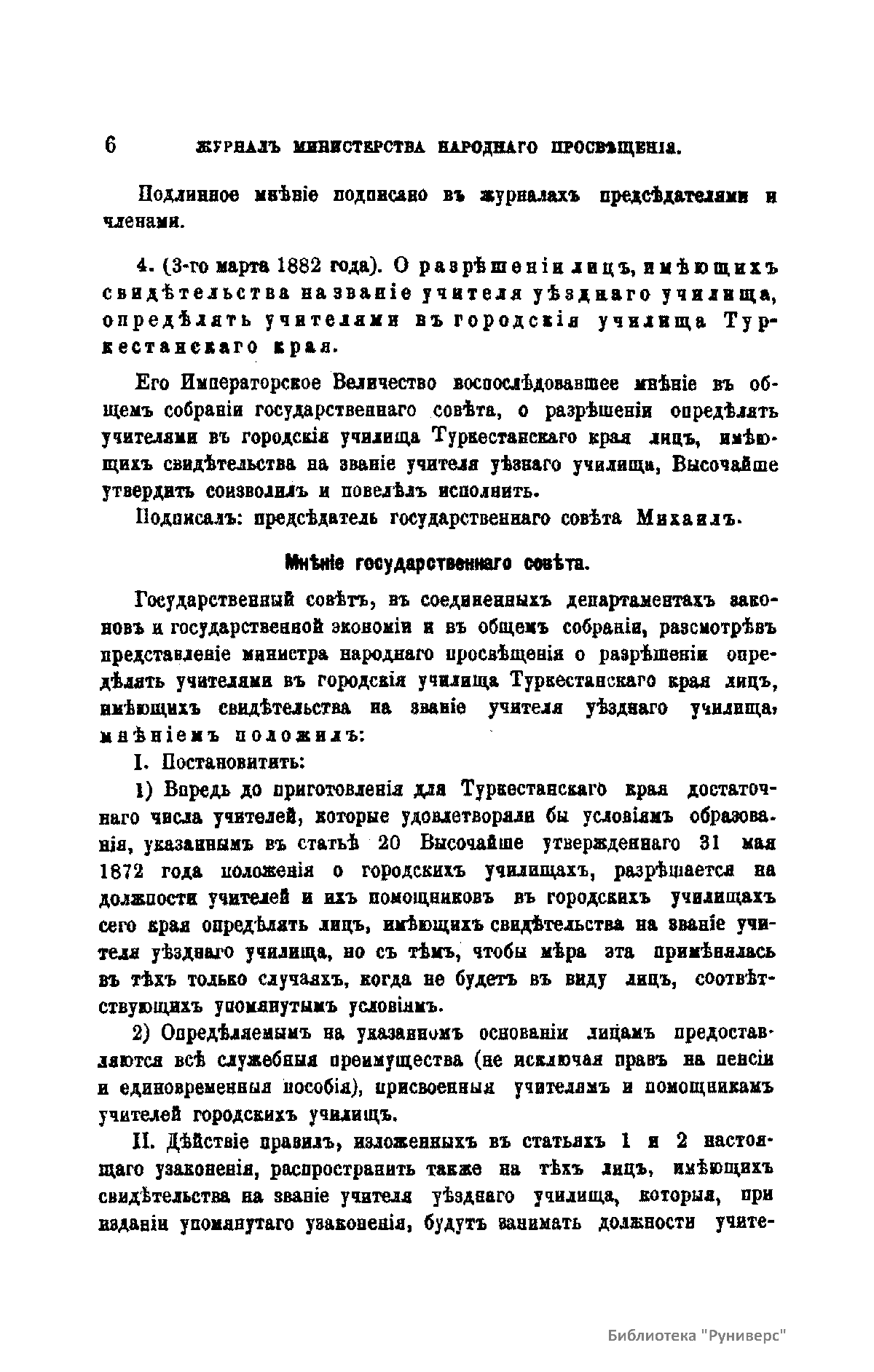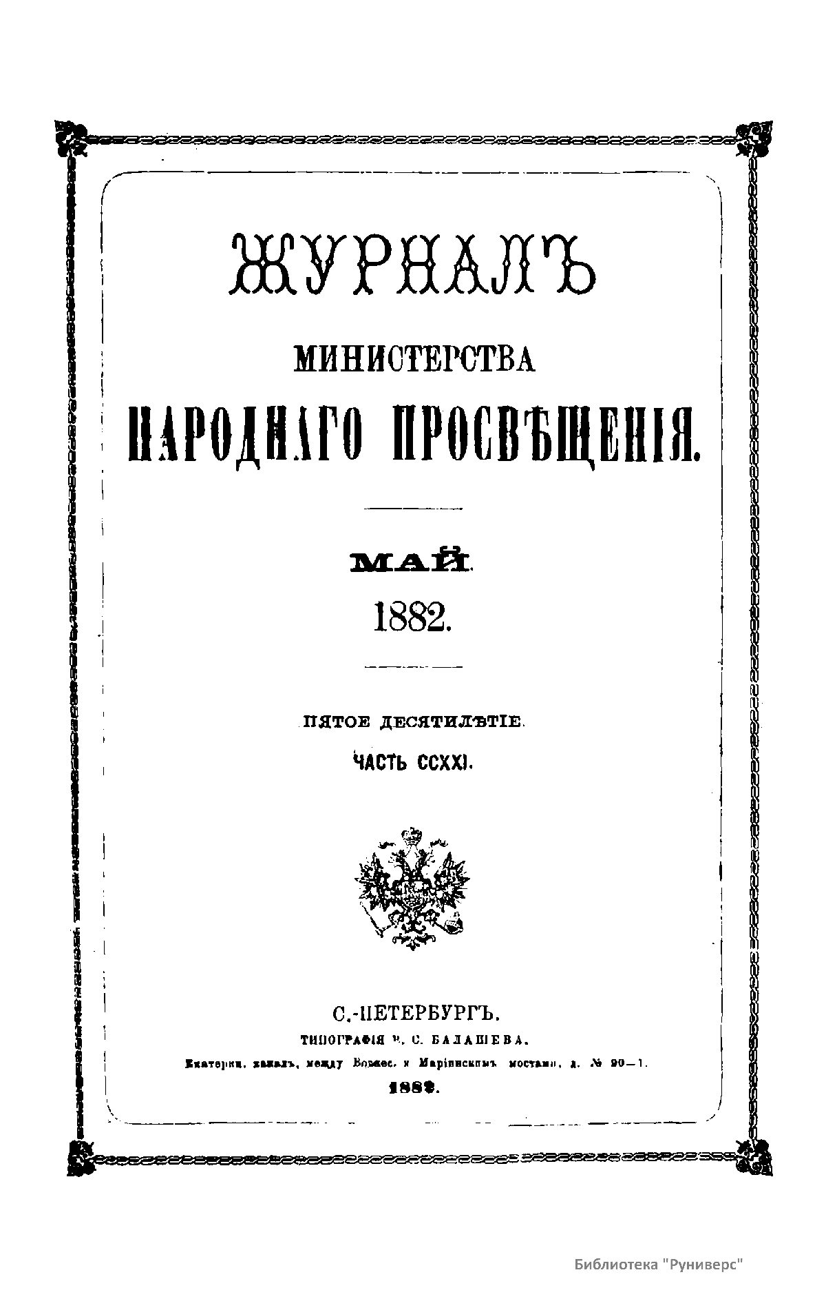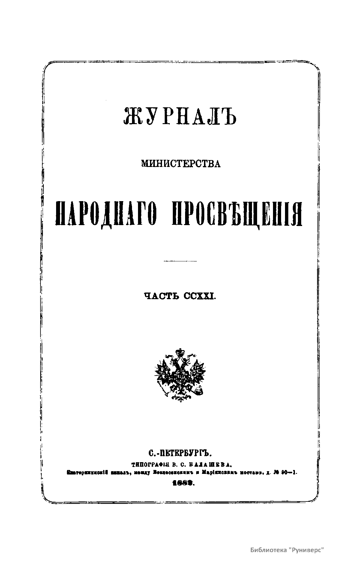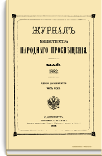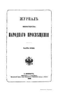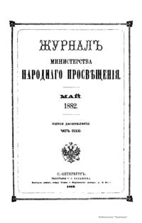 Журнал Министерства народного просвещения выходил с 1834-го по 1917 год. Официальный периодический журнал об успехах просвещения в России. Издатели журнала уверены в том, что «если для каждого человека необходим выход из грубой тьмы невежества и беспрерывное дальнейшее движение к свету, то для народов необходимо попечительное участие правительства в образовании. Только правительство имеет все средства знать и высоту успехов всемирного образования, и настоящие нужды Отечества».