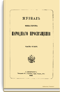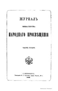 Журнал Министерства народного просвещения выходил с 1834-го по 1917 год. Официальный периодический журнал об успехах просвещения в России. Издатели журнала уверены в том, что «если для каждого человека необходим выход из грубой тьмы невежества и беспрерывное дальнейшее движение к свету, то для народов необходимо попечительное участие правительства в образовании. Только правительство имеет все средства знать и высоту успехов всемирного образования, и настоящие нужды Отечества».
