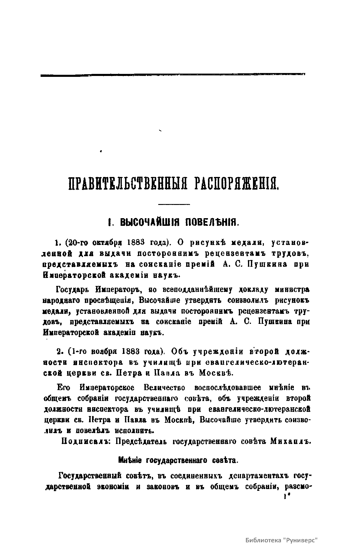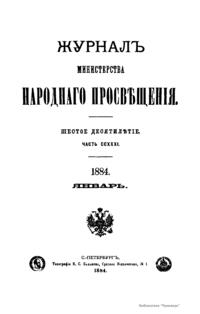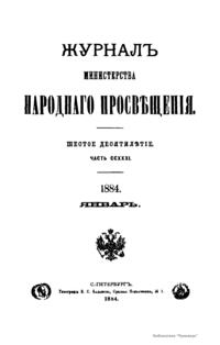 Журнал Министерства народного просвещения выходил с 1834-го по 1917 год. Официальный периодический журнал об успехах просвещения в России. Издатели журнала уверены в том, что «если для каждого человека необходим выход из грубой тьмы невежества и беспрерывное дальнейшее движение к свету, то для народов необходимо попечительное участие правительства в образовании. Только правительство имеет все средства знать и высоту успехов всемирного образования, и настоящие нужды Отечества».