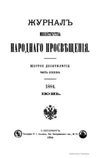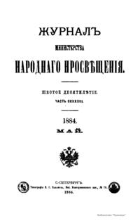 Журнал Министерства народного просвещения выходил с 1834-го по 1917 год. Официальный периодический журнал об успехах просвещения в России. Издатели журнала уверены в том, что «если для каждого человека необходим выход из грубой тьмы невежества и беспрерывное дальнейшее движение к свету, то для народов необходимо попечительное участие правительства в образовании. Только правительство имеет все средства знать и высоту успехов всемирного образования, и настоящие нужды Отечества».
