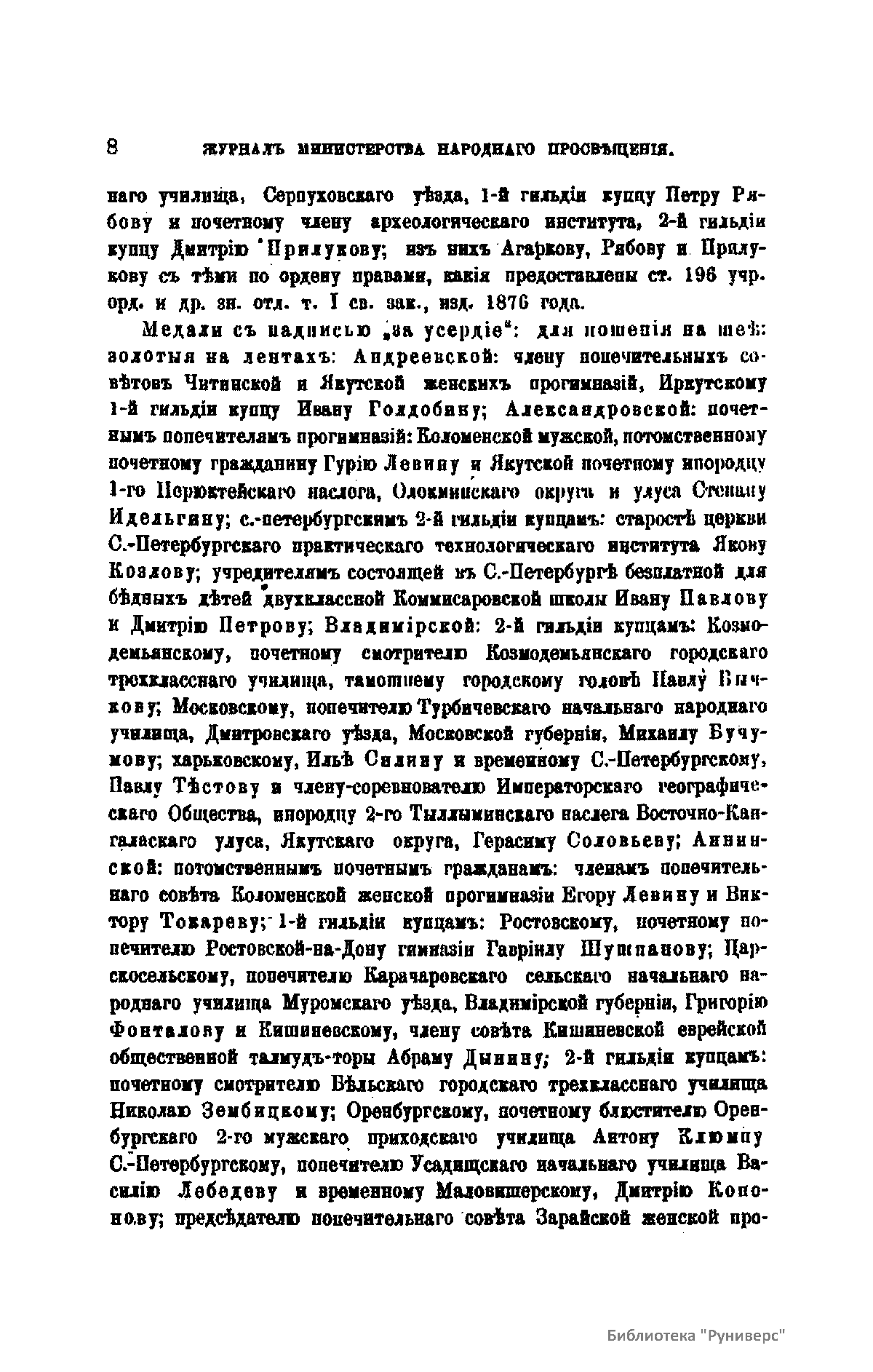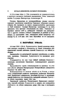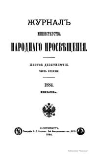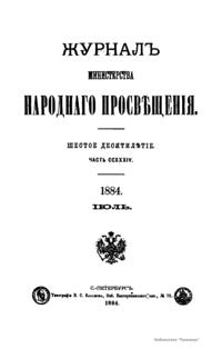 Журнал Министерства народного просвещения выходил с 1834-го по 1917 год. Официальный периодический журнал об успехах просвещения в России. Издатели журнала уверены в том, что «если для каждого человека необходим выход из грубой тьмы невежества и беспрерывное дальнейшее движение к свету, то для народов необходимо попечительное участие правительства в образовании. Только правительство имеет все средства знать и высоту успехов всемирного образования, и настоящие нужды Отечества».