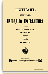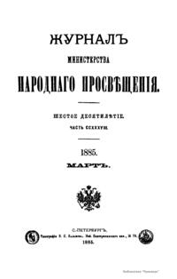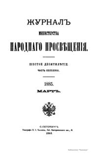 Журнал Министерства народного просвещения выходил с 1834-го по 1917 год. Официальный периодический журнал об успехах просвещения в России. Издатели журнала уверены в том, что «если для каждого человека необходим выход из грубой тьмы невежества и беспрерывное дальнейшее движение к свету, то для народов необходимо попечительное участие правительства в образовании. Только правительство имеет все средства знать и высоту успехов всемирного образования, и настоящие нужды Отечества».
