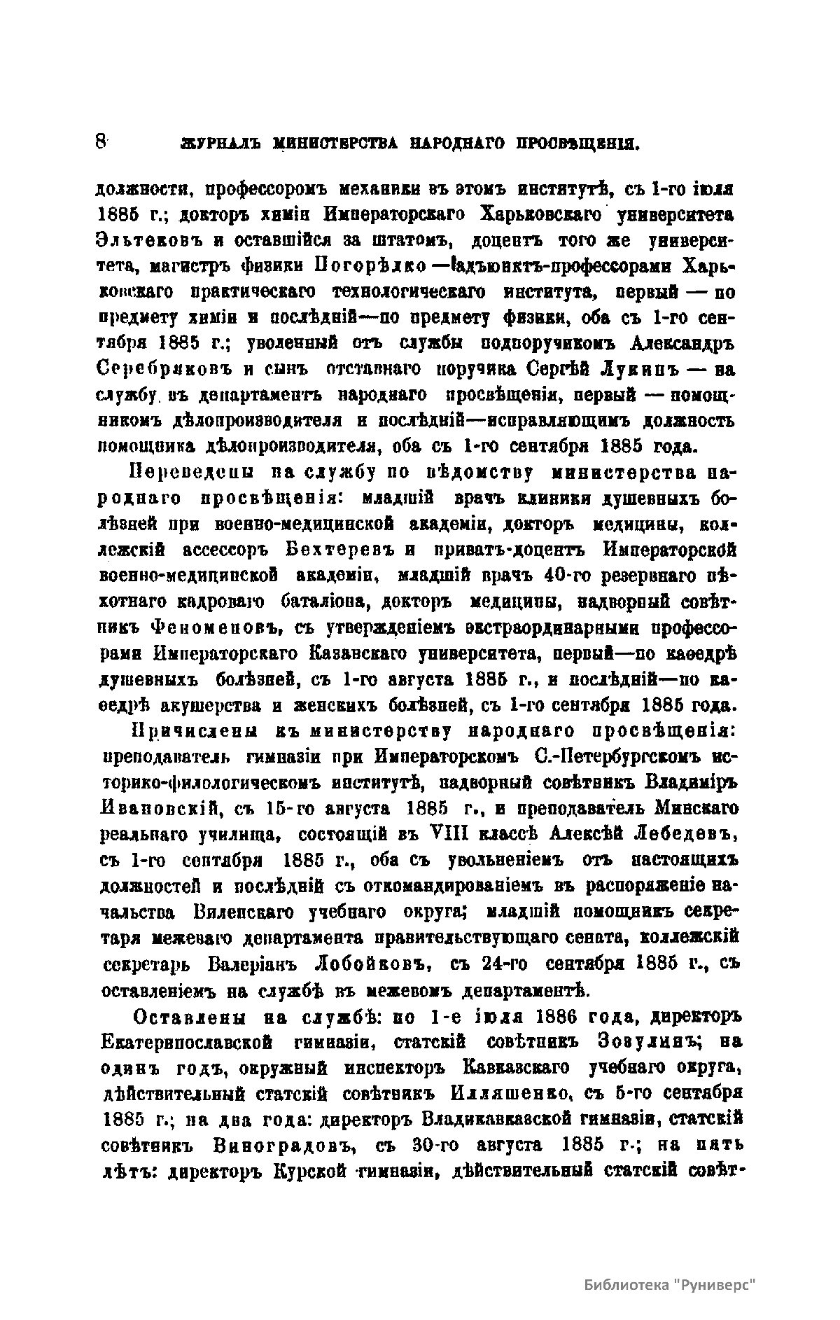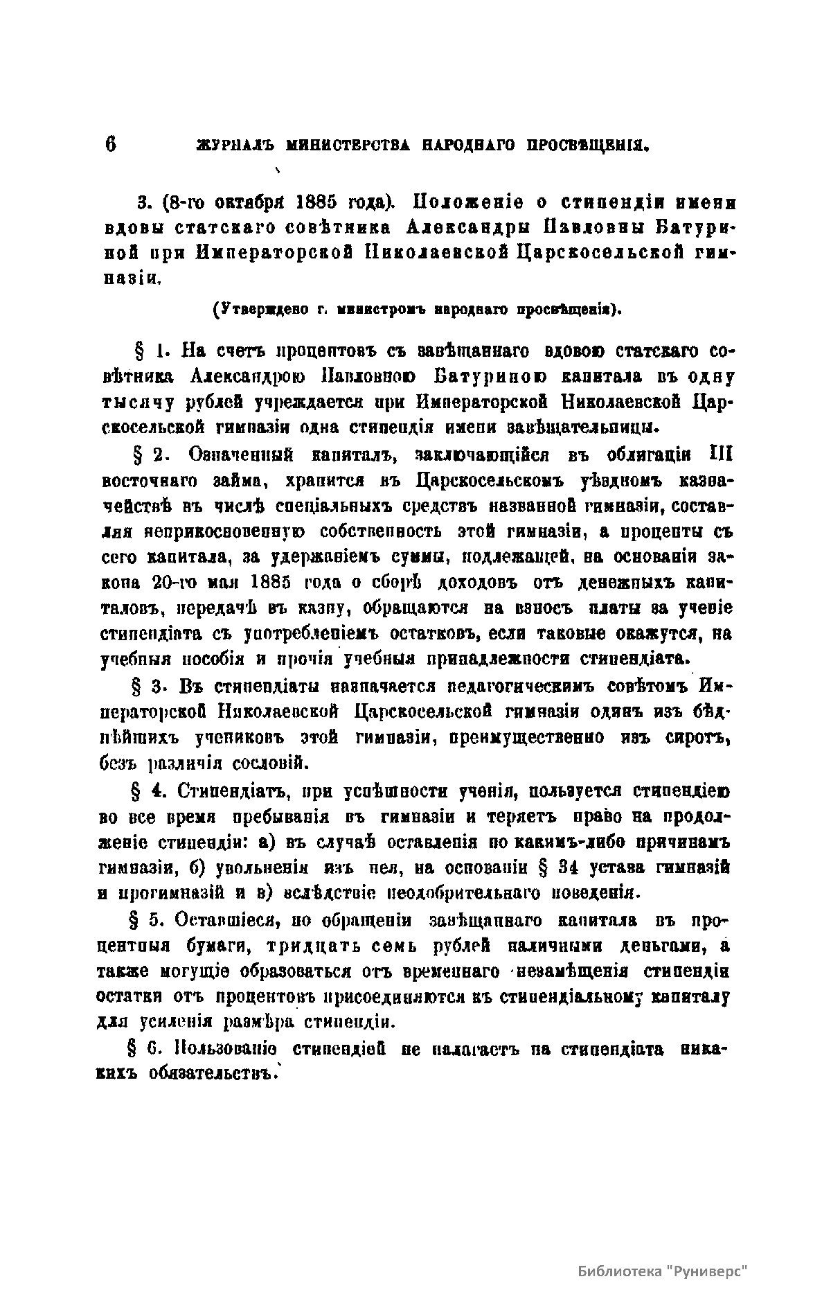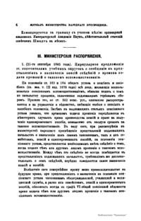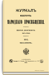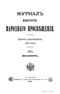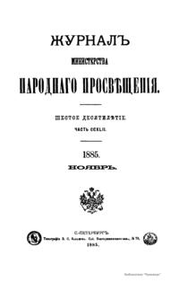 Журнал Министерства народного просвещения выходил с 1834-го по 1917 год. Официальный периодический журнал об успехах просвещения в России. Издатели журнала уверены в том, что «если для каждого человека необходим выход из грубой тьмы невежества и беспрерывное дальнейшее движение к свету, то для народов необходимо попечительное участие правительства в образовании. Только правительство имеет все средства знать и высоту успехов всемирного образования, и настоящие нужды Отечества».