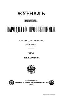 Журнал Министерства народного просвещения выходил с 1834-го по 1917 год. Официальный периодический журнал об успехах просвещения в России. Издатели журнала уверены в том, что «если для каждого человека необходим выход из грубой тьмы невежества и беспрерывное дальнейшее движение к свету, то для народов необходимо попечительное участие правительства в образовании. Только правительство имеет все средства знать и высоту успехов всемирного образования, и настоящие нужды Отечества».