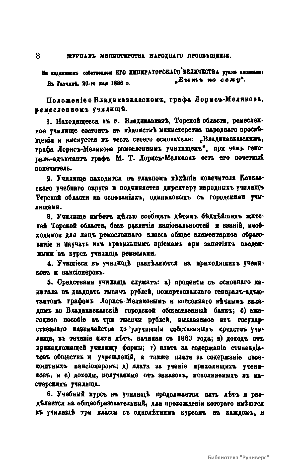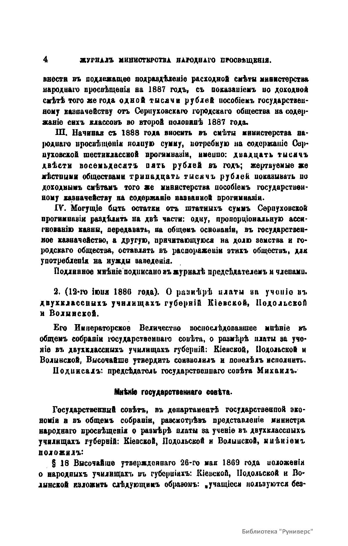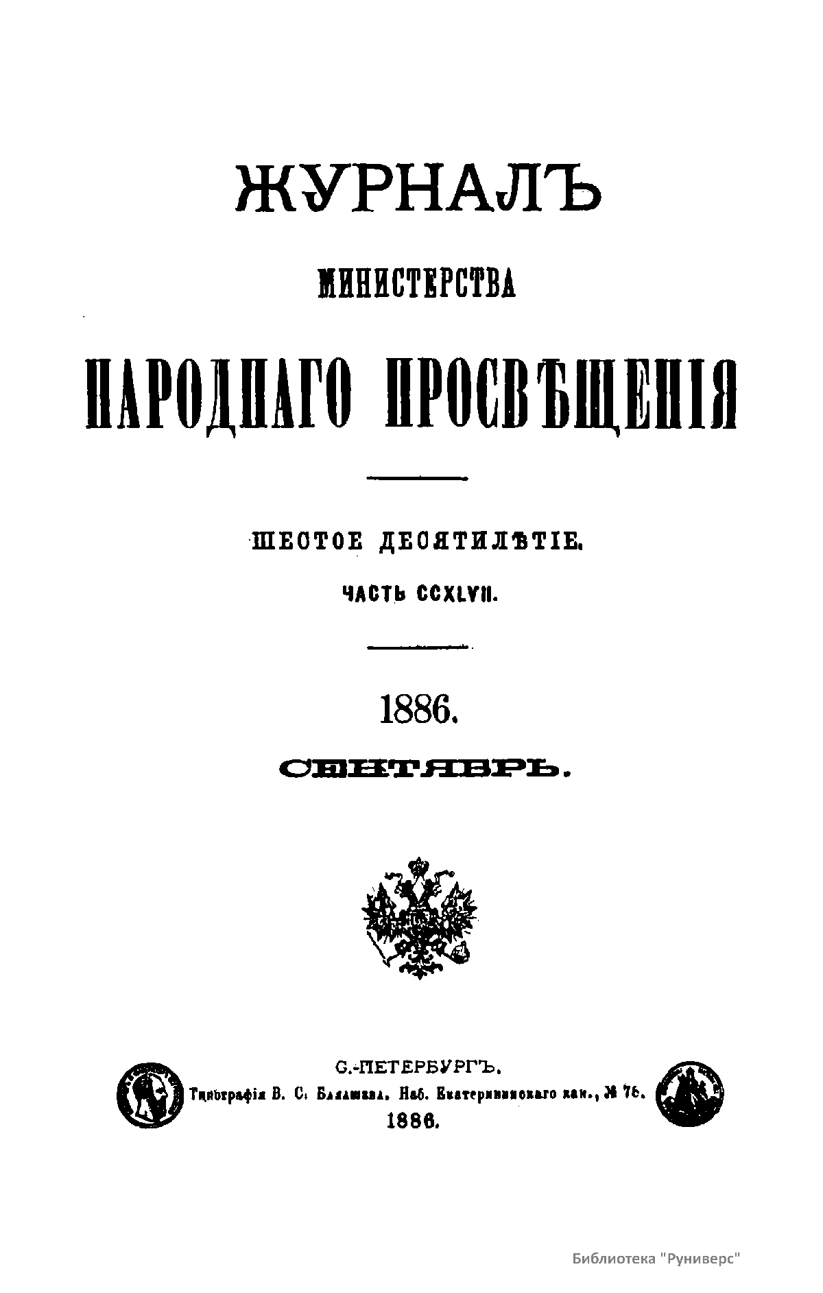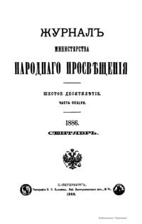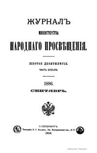 Журнал Министерства народного просвещения выходил с 1834-го по 1917 год. Официальный периодический журнал об успехах просвещения в России. Издатели журнала уверены в том, что «если для каждого человека необходим выход из грубой тьмы невежества и беспрерывное дальнейшее движение к свету, то для народов необходимо попечительное участие правительства в образовании. Только правительство имеет все средства знать и высоту успехов всемирного образования, и настоящие нужды Отечества».