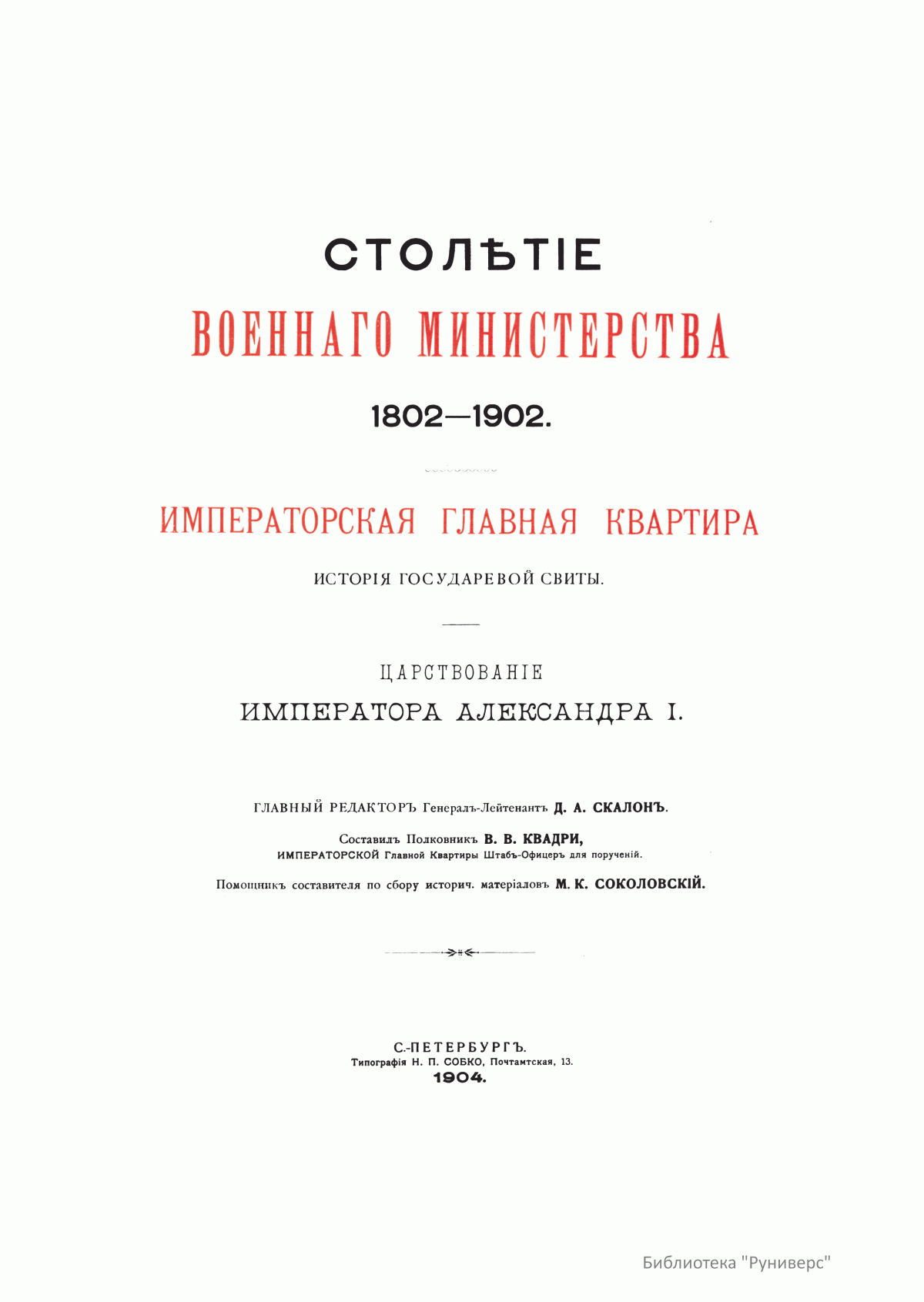 Столѣтiе военнаго министерства. 1802-1902. Императорская главная квартира. Исторiя государевой свиты. Царствованiе Императора Александра I. Книга 1