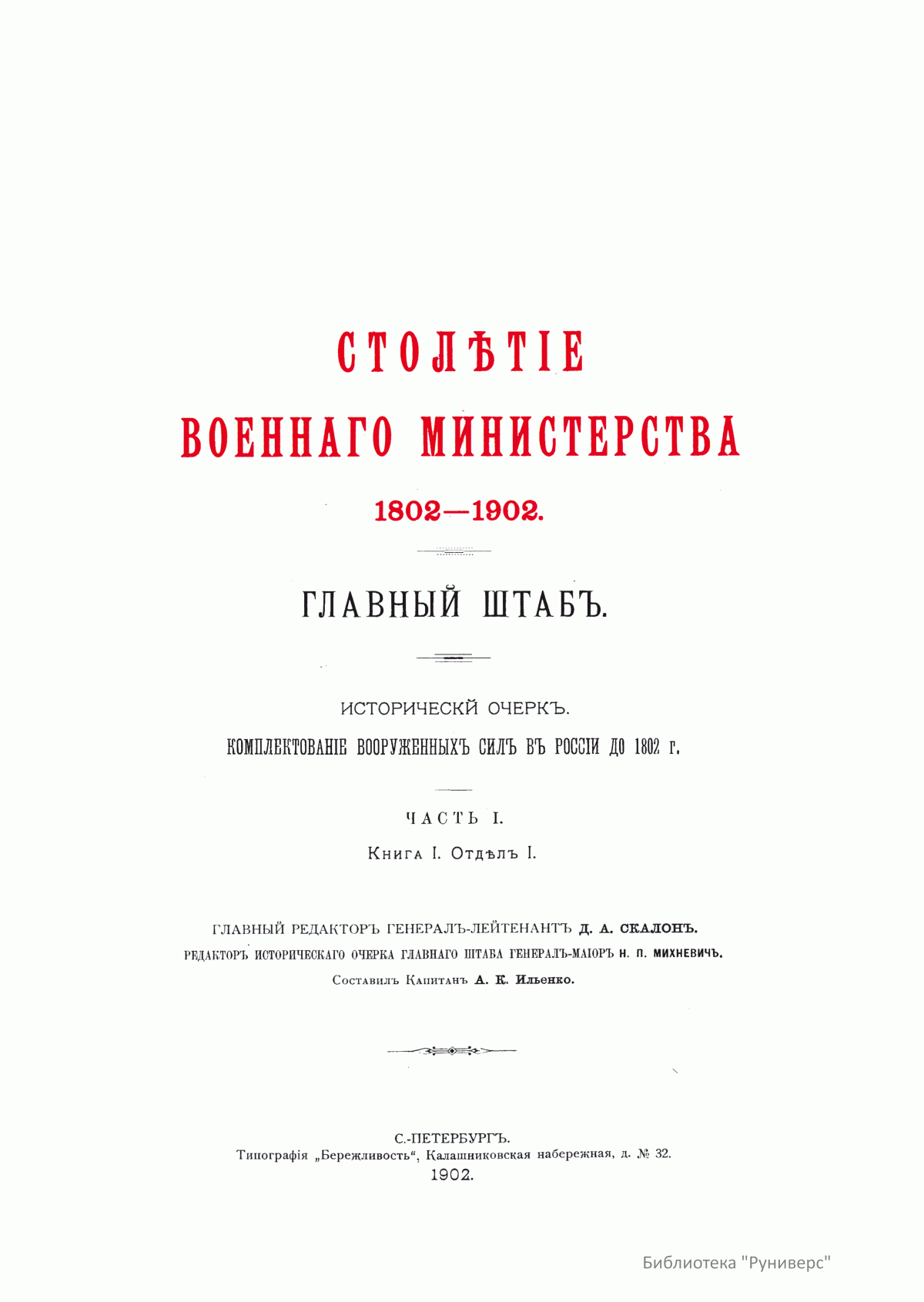 1902 году в России отмечался столетний юбилей образования в России министерств. Император Николай II перед празднованием юбилея отдал распоряжение о написании книг, посвященных истории деятельности министерств и ведомств за 100 лет. Военному министру генерал-лейтенанту Д. А. Скалону было отдано распоряжение составить историю военного министерства.