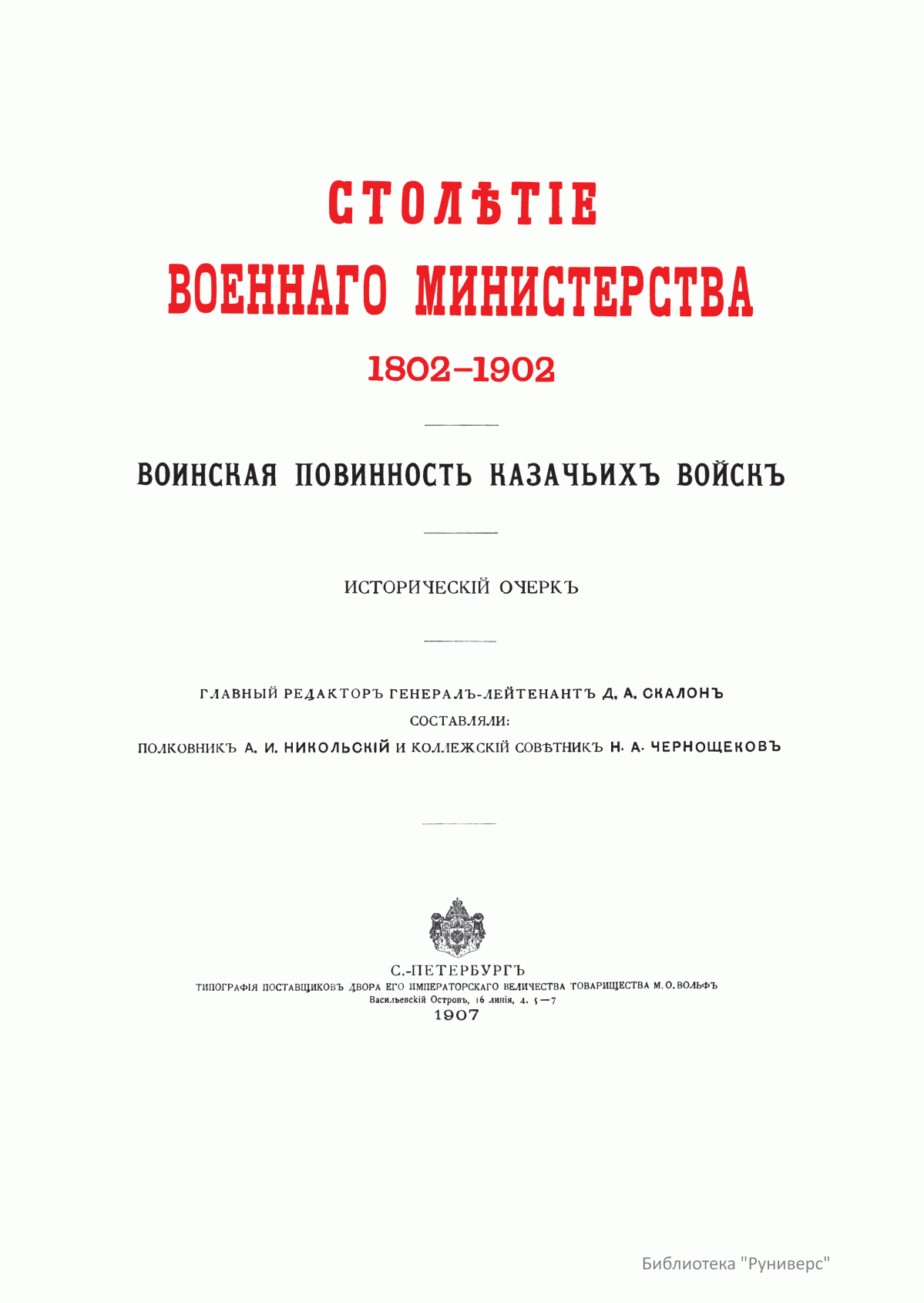 Столѣтiе военнаго министерства. 1802-1902. Воинская повинность казачьихъ войскъ. Историческiй очеркъ