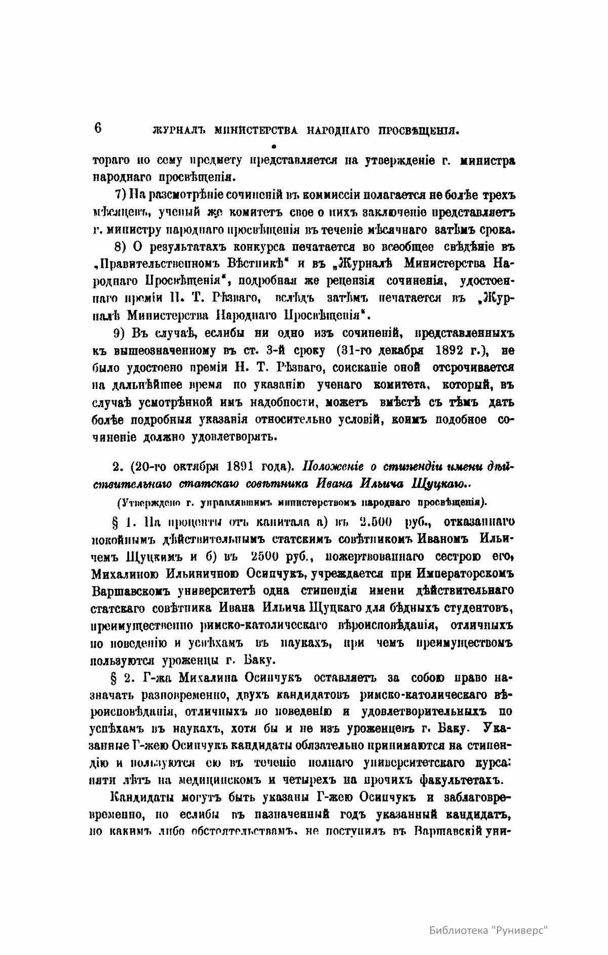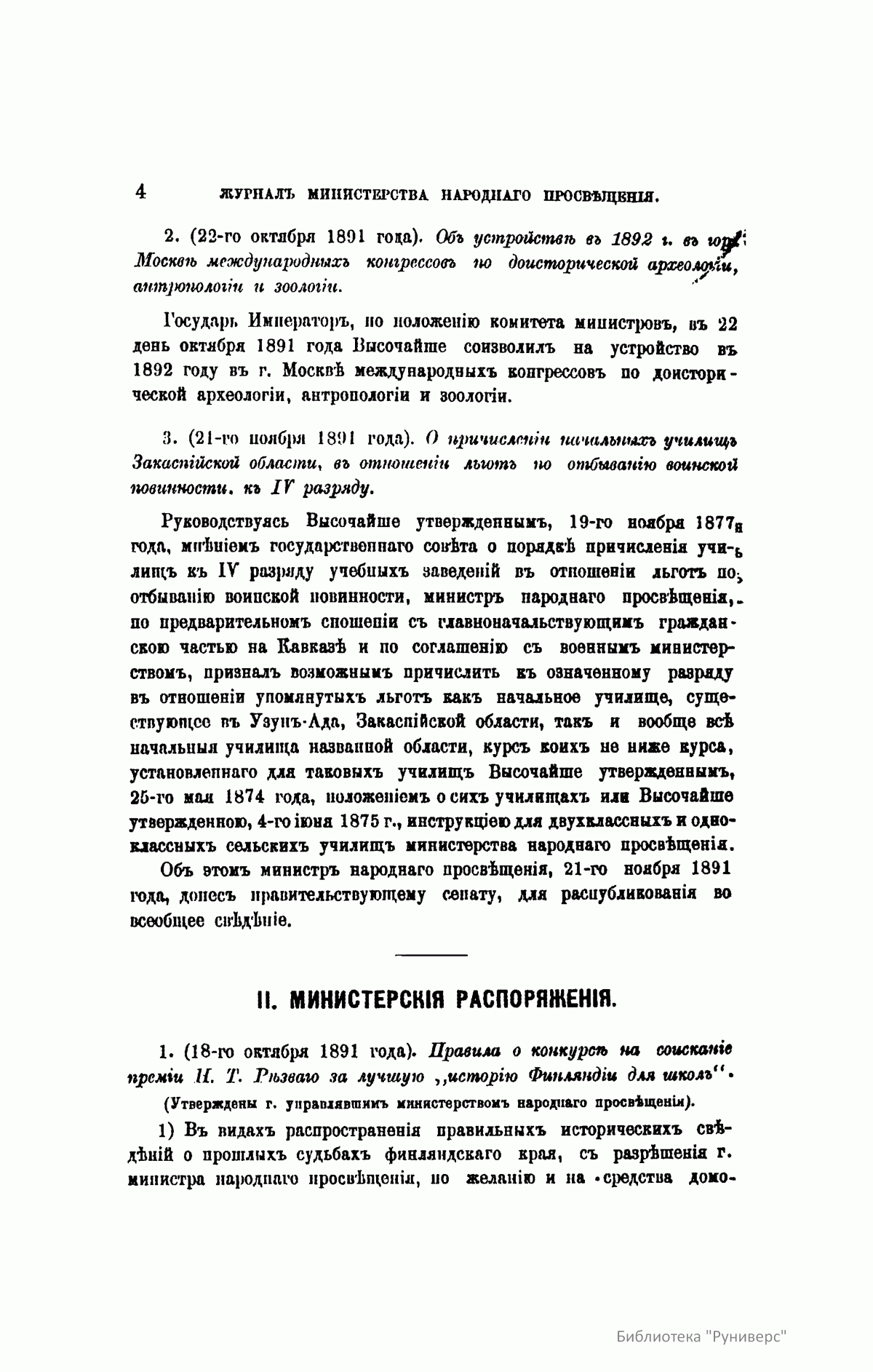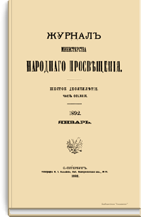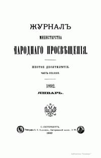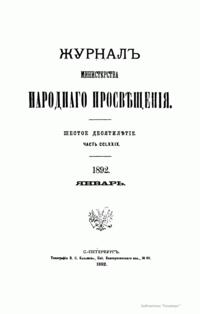 Журнал Министерства народного просвещения выходил с 1834-го по 1917 год. Официальный периодический журнал об успехах просвещения в России. Издатели журнала уверены в том, что «если для каждого человека необходим выход из грубой тьмы невежества и беспрерывное дальнейшее движение к свету, то для народов необходимо попечительное участие правительства в образовании. Только правительство имеет все средства знать и высоту успехов всемирного образования, и настоящие нужды Отечества».