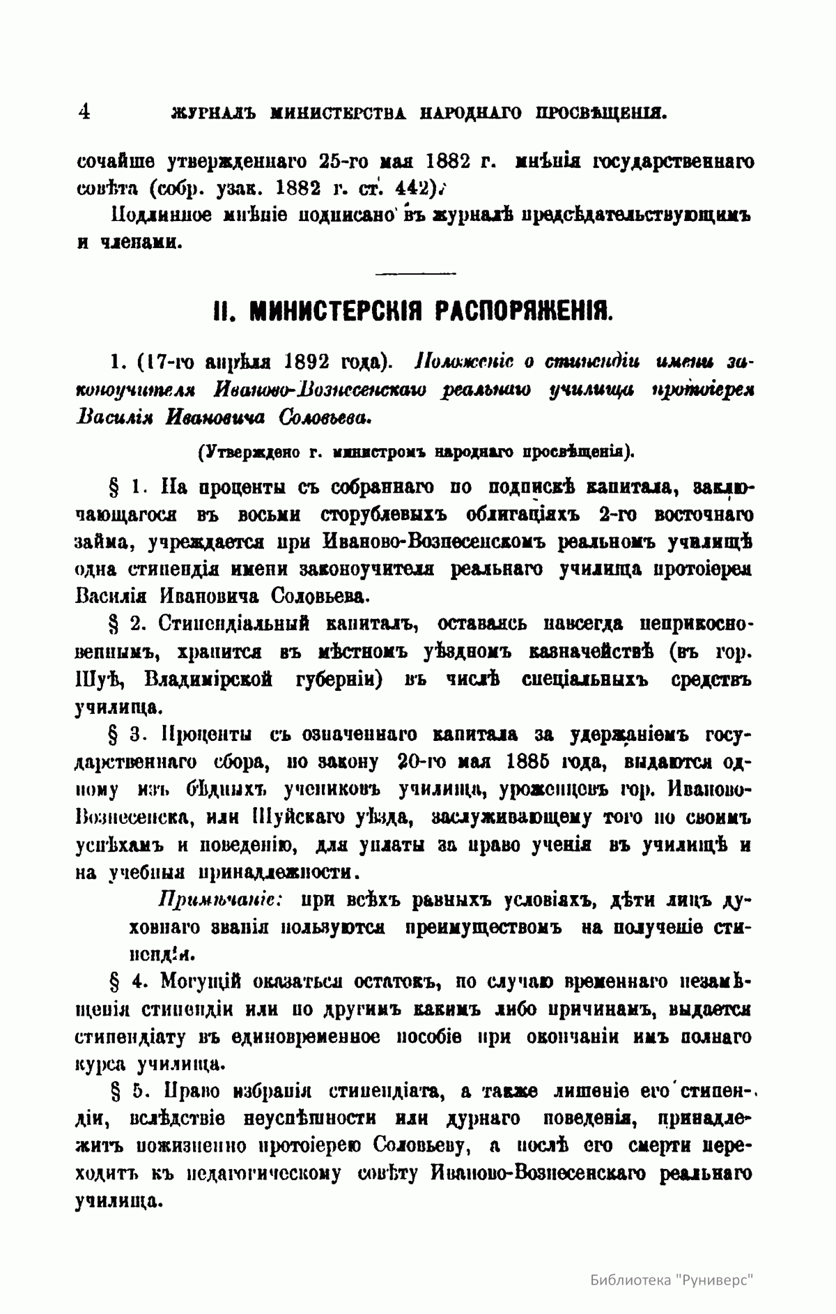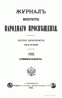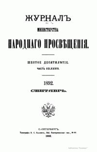 Журнал Министерства народного просвещения выходил с 1834-го по 1917 год. Официальный периодический журнал об успехах просвещения в России. Издатели журнала уверены в том, что «если для каждого человека необходим выход из грубой тьмы невежества и беспрерывное дальнейшее движение к свету, то для народов необходимо попечительное участие правительства в образовании. Только правительство имеет все средства знать и высоту успехов всемирного образования, и настоящие нужды Отечества».