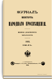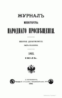 Журнал Министерства народного просвещения выходил с 1834-го по 1917 год. Официальный периодический журнал об успехах просвещения в России. Издатели журнала уверены в том, что «если для каждого человека необходим выход из грубой тьмы невежества и беспрерывное дальнейшее движение к свету, то для народов необходимо попечительное участие правительства в образовании. Только правительство имеет все средства знать и высоту успехов всемирного образования, и настоящие нужды Отечества».