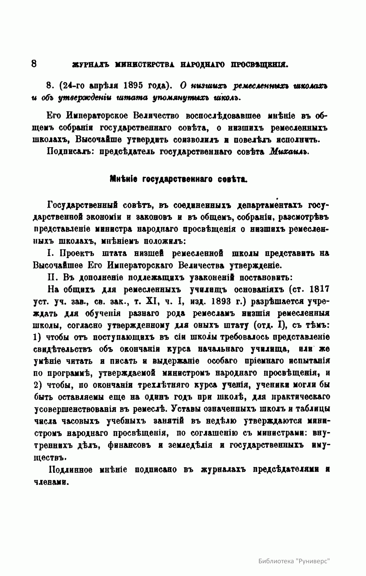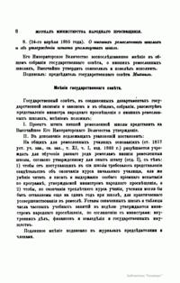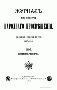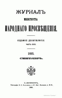 Журнал Министерства народного просвещения выходил с 1834-го по 1917 год. Официальный периодический журнал об успехах просвещения в России. Издатели журнала уверены в том, что «если для каждого человека необходим выход из грубой тьмы невежества и беспрерывное дальнейшее движение к свету, то для народов необходимо попечительное участие правительства в образовании. Только правительство имеет все средства знать и высоту успехов всемирного образования, и настоящие нужды Отечества».