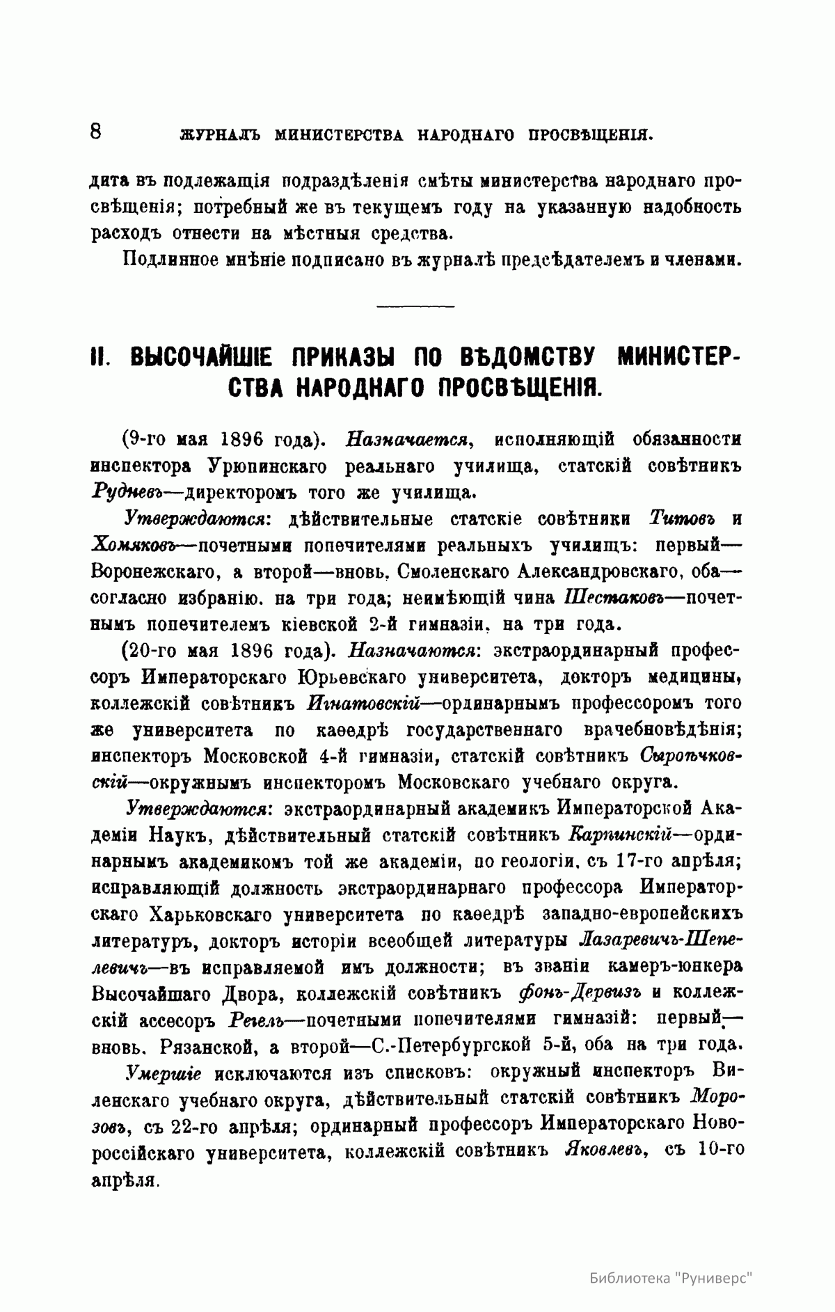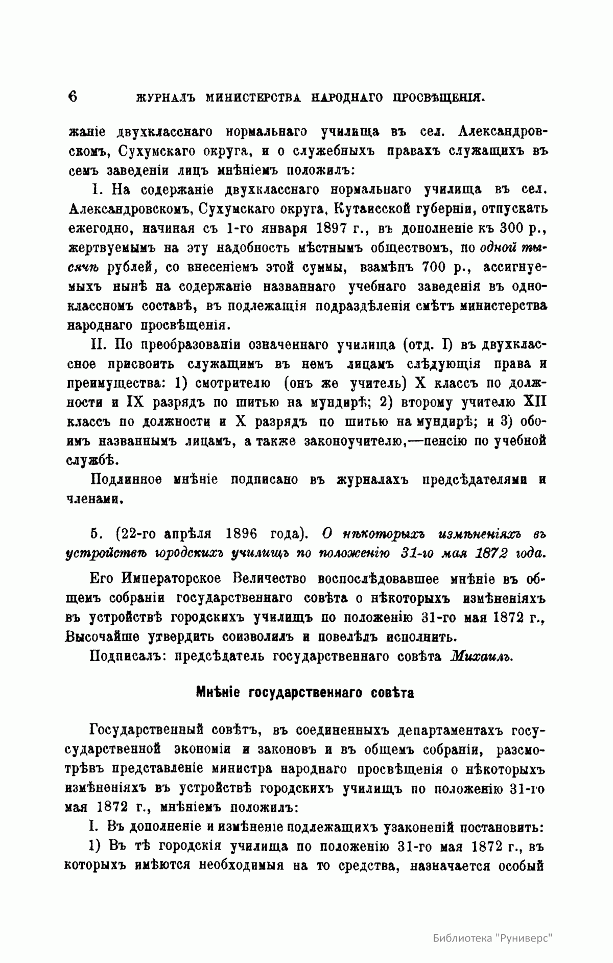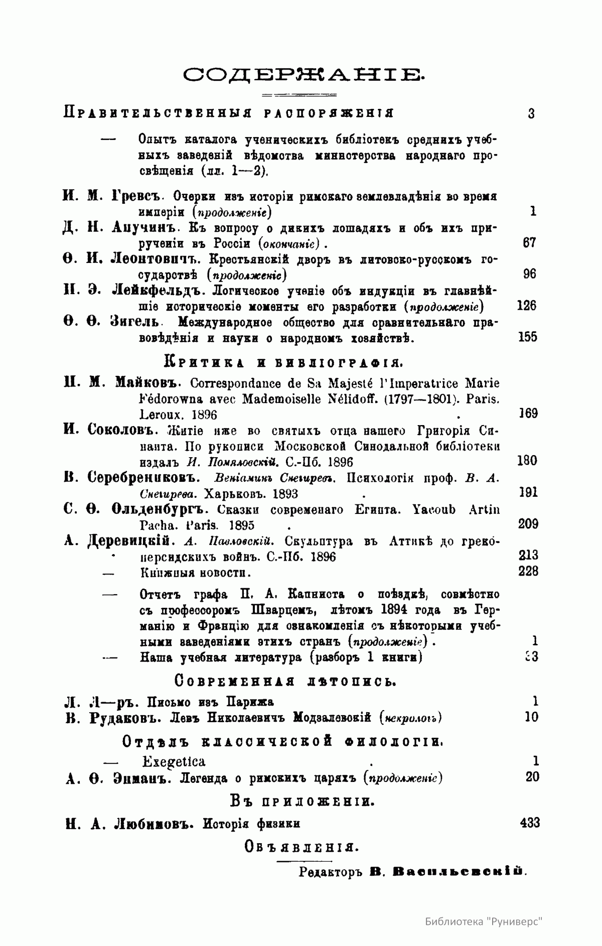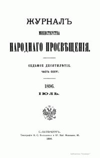 Журнал Министерства народного просвещения выходил с 1834-го по 1917 год. Официальный периодический журнал об успехах просвещения в России. Издатели журнала уверены в том, что «если для каждого человека необходим выход из грубой тьмы невежества и беспрерывное дальнейшее движение к свету, то для народов необходимо попечительное участие правительства в образовании. Только правительство имеет все средства знать и высоту успехов всемирного образования, и настоящие нужды Отечества».