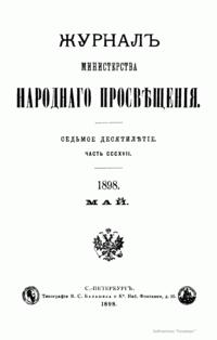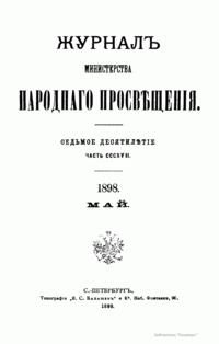 Журнал Министерства народного просвещения выходил с 1834-го по 1917 год. Официальный периодический журнал об успехах просвещения в России. Издатели журнала уверены в том, что «если для каждого человека необходим выход из грубой тьмы невежества и беспрерывное дальнейшее движение к свету, то для народов необходимо попечительное участие правительства в образовании. Только правительство имеет все средства знать и высоту успехов всемирного образования, и настоящие нужды Отечества».