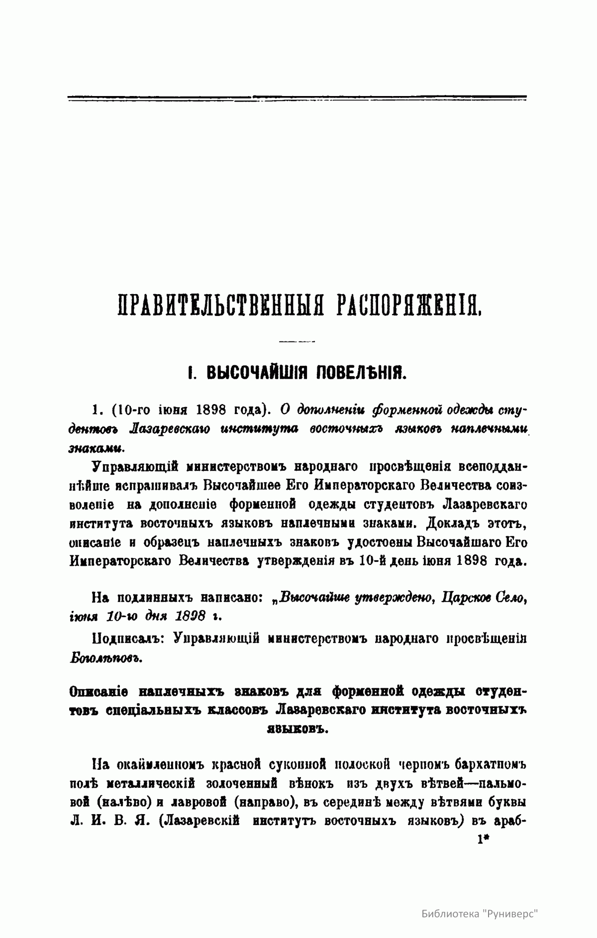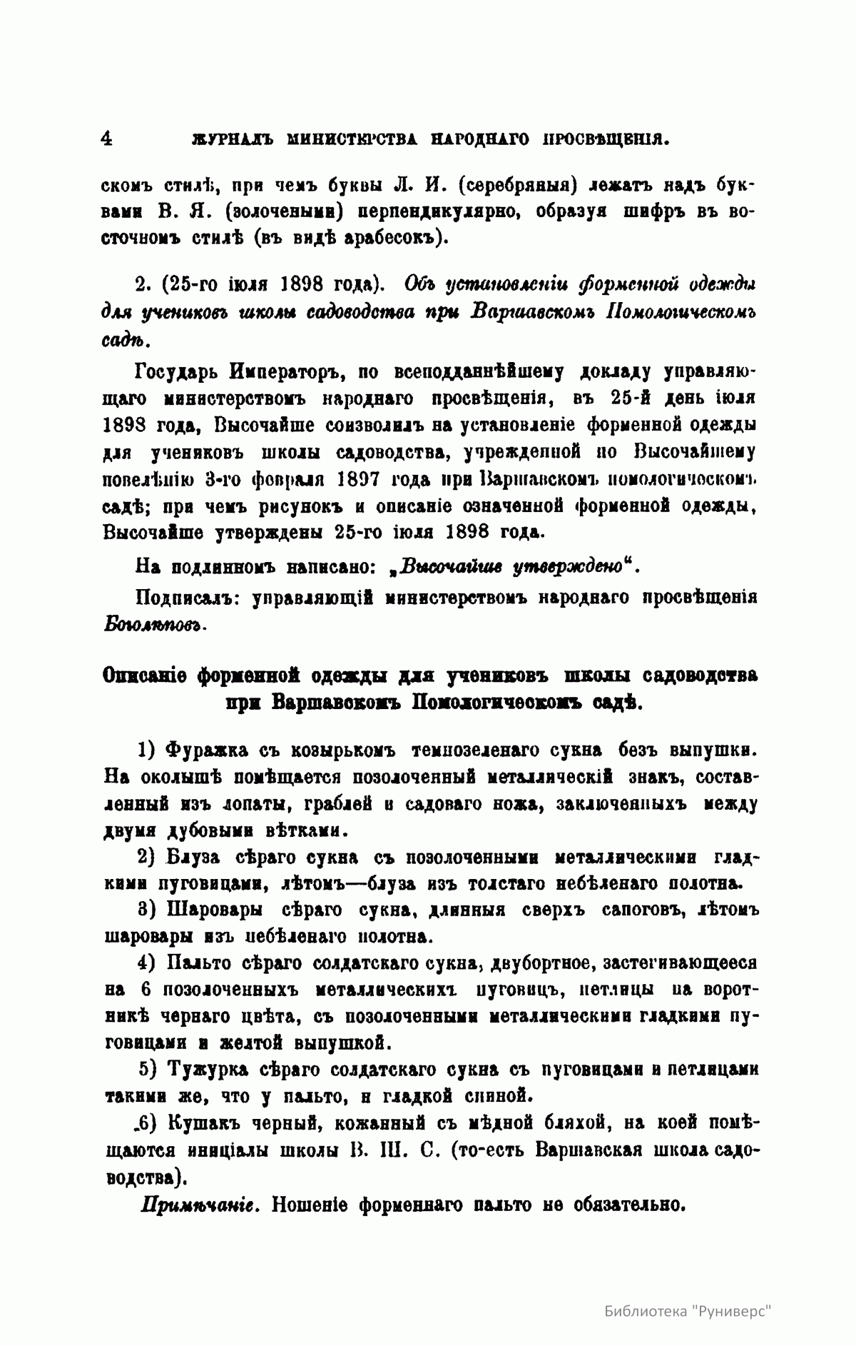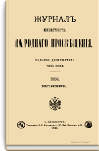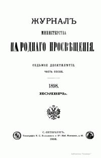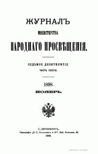 Журнал Министерства народного просвещения выходил с 1834-го по 1917 год. Официальный периодический журнал об успехах просвещения в России. Издатели журнала уверены в том, что «если для каждого человека необходим выход из грубой тьмы невежества и беспрерывное дальнейшее движение к свету, то для народов необходимо попечительное участие правительства в образовании. Только правительство имеет все средства знать и высоту успехов всемирного образования, и настоящие нужды Отечества».